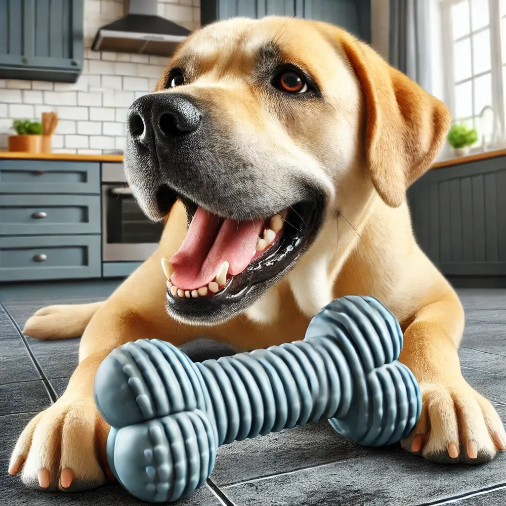 대표적인 예로 고무 소재의 튼튼한 씹는 장난감이 있습니다.