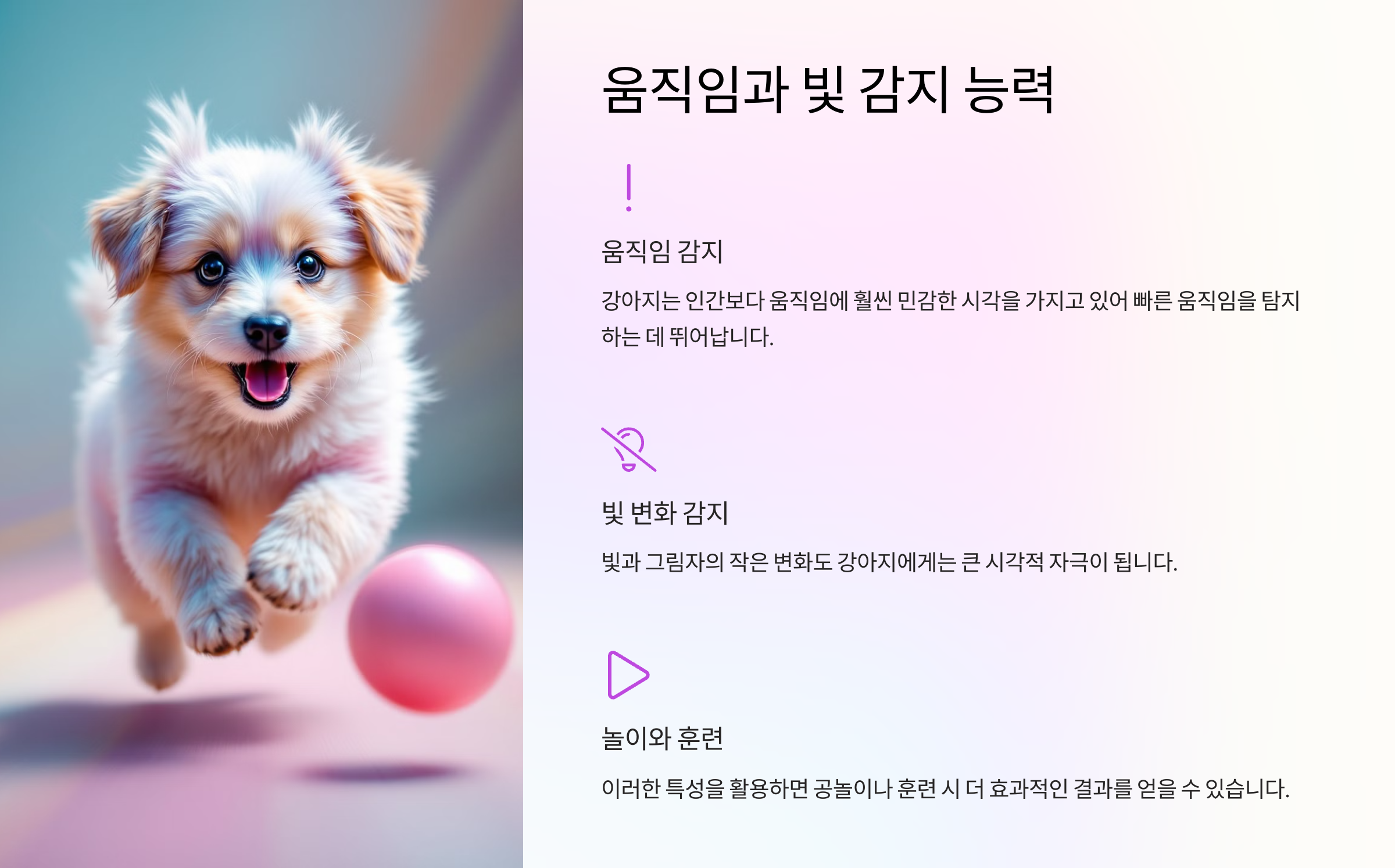 강아지의 움직임과 빛 감지 능력을 활용하면 강아지와의 상호작용이 더욱 재미있고 유익해집니다. 이를 통해 강아지는 환경에 대한 자신감을 얻고, 놀이와 훈련에서 더 높은 만족감을 느낄 수 있습니다.