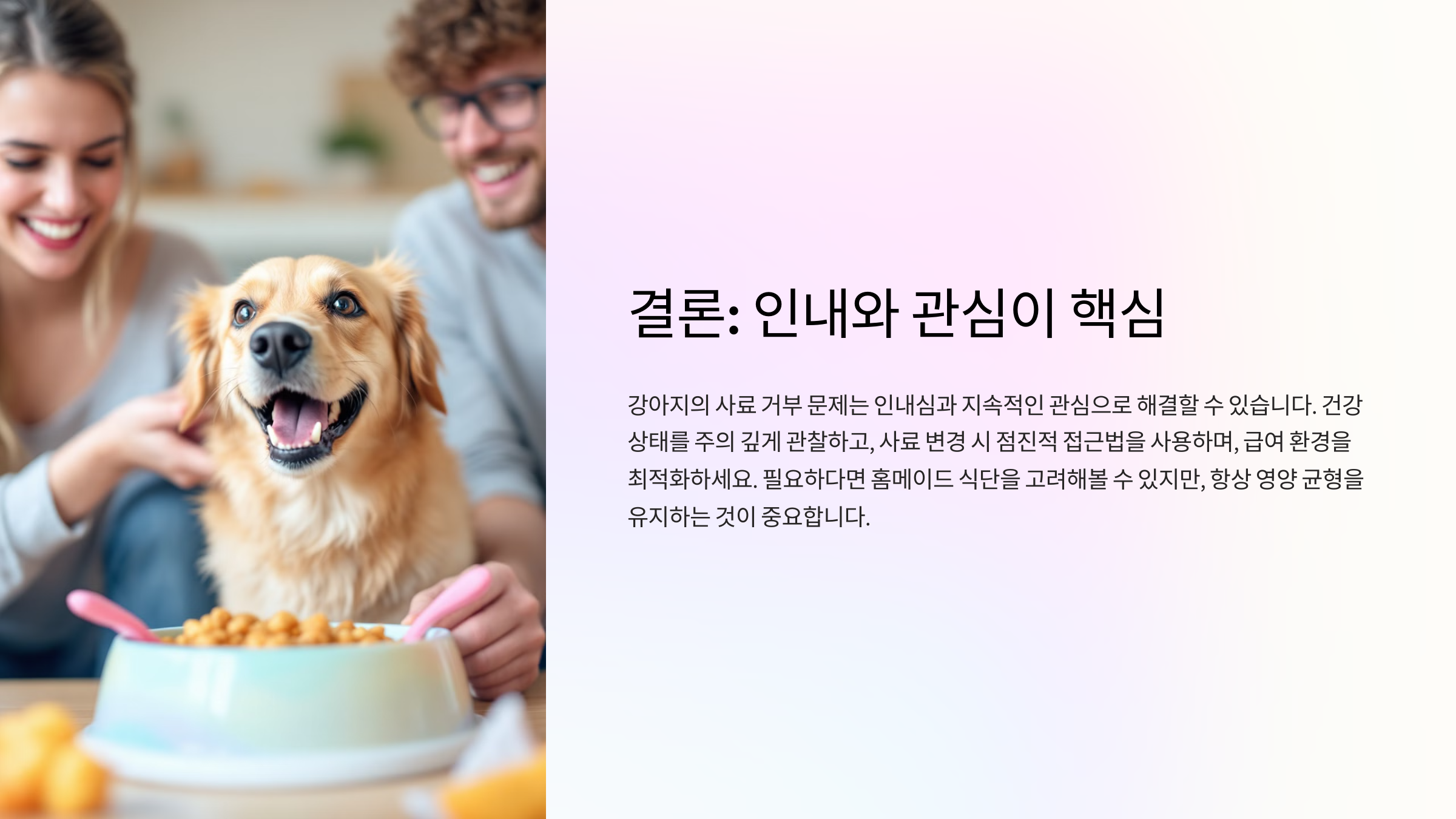 강아지가 사료를 거부하는 상황은 반려인에게 스트레스를 줄 수 있습니다. 하지만 이를 해결하려면 강아지의 행동을 세심히 관찰하고, 문제의 원인을 정확히 파악하는 것이 무엇보다 중요합니다. 식욕 부진은 단순히 일시적인 기호 변화부터 심각한 건강 문제에 이르기까지 다양한 이유에서 발생할 수 있습니다. 원인을 올바르게 분석하고 효과적인 대처 방안을 실행하면 강아지가 다시 건강하고 활기차게 사료를 먹도록 도울 수 있습니다.