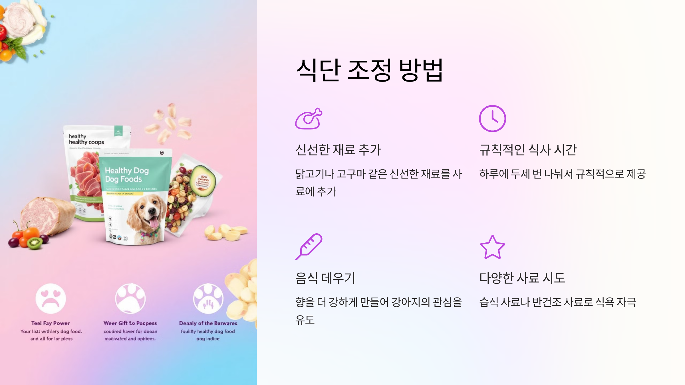 강아지의 식단을 조정하면 식욕 회복과 건강 유지에 큰 도움이 될 수 있습니다. 강아지가 선호하는 음식을 파악하고, 영양 균형을 유지하면서 신선한 재료를 추가하는 것이 핵심입니다.