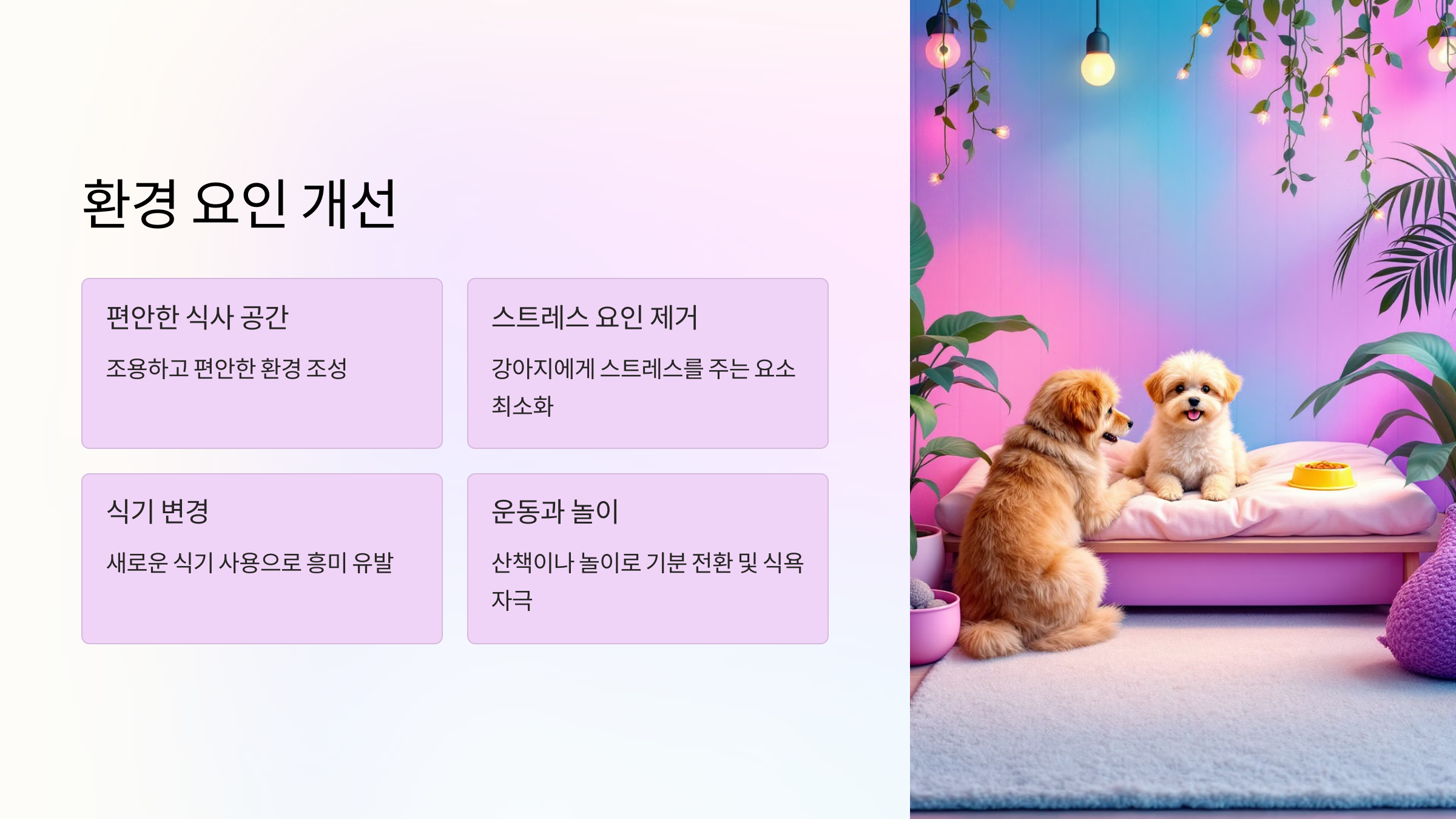 강아지의 식사 환경은 식욕에 큰 영향을 미칠 수 있으므로, 환경적 요인을 조정하는 것이 중요합니다.