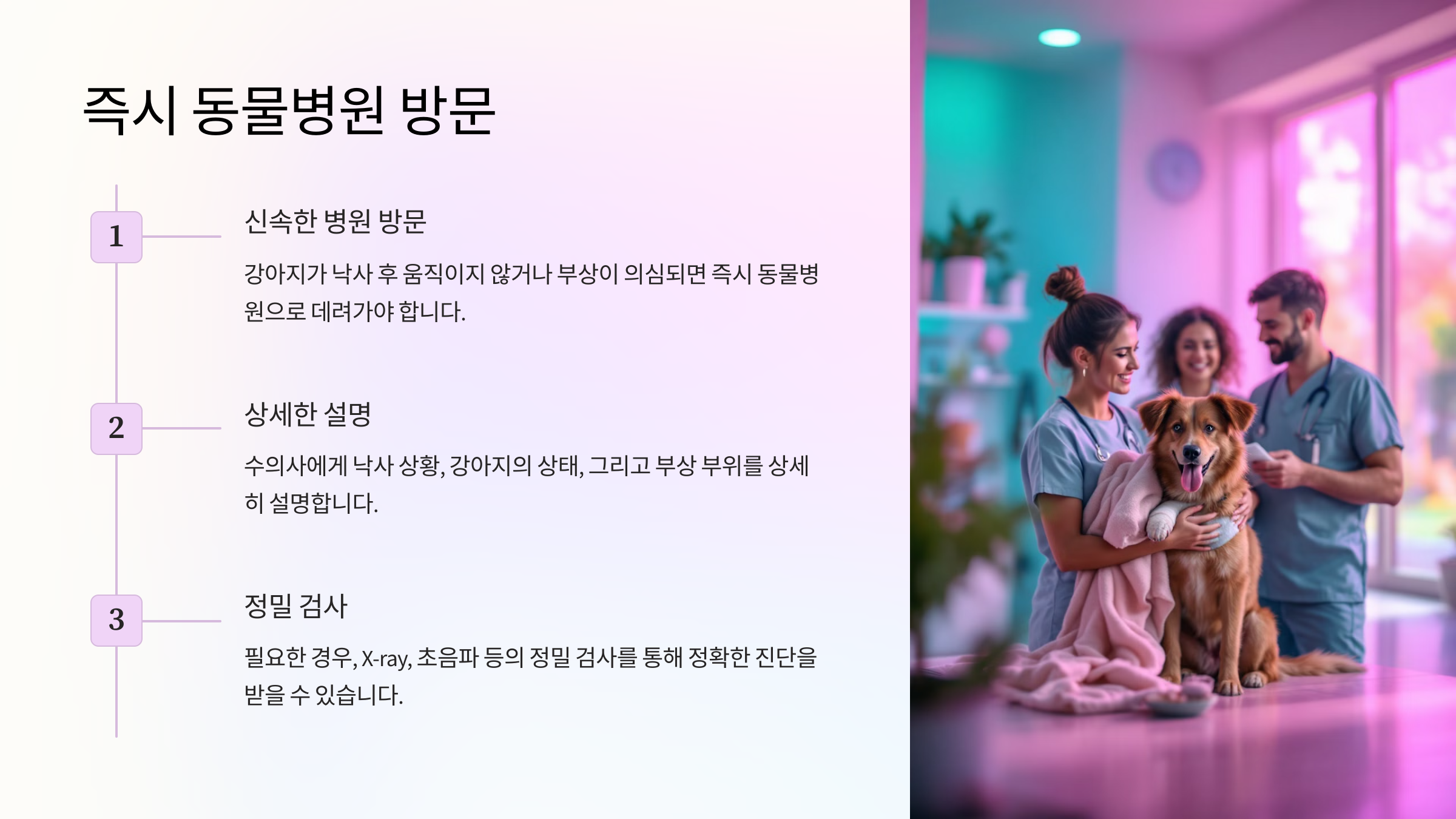 동물병원에 도착하면 수의사에게 낙사 당시 상황, 강아지의 상태 변화, 부상 부위를 자세히 설명합니다. 사고 경위와 시간 등을 구체적으로 전달하면 수의사가 빠르게 적절한 조치를 취할 수 있습니다. - 정밀 검사 시행
