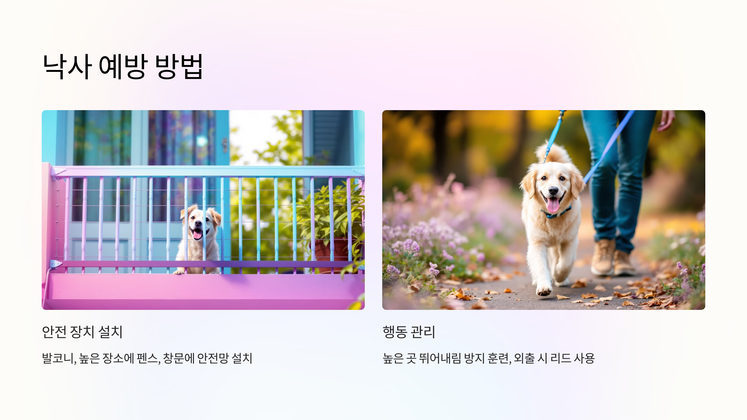 실내 바닥에 미끄럼 방지 매트를 설치하여 강아지가 발판에서 미끄러져 낙사하는 사고를 예방합니다. - 야외 활동 시 주의
