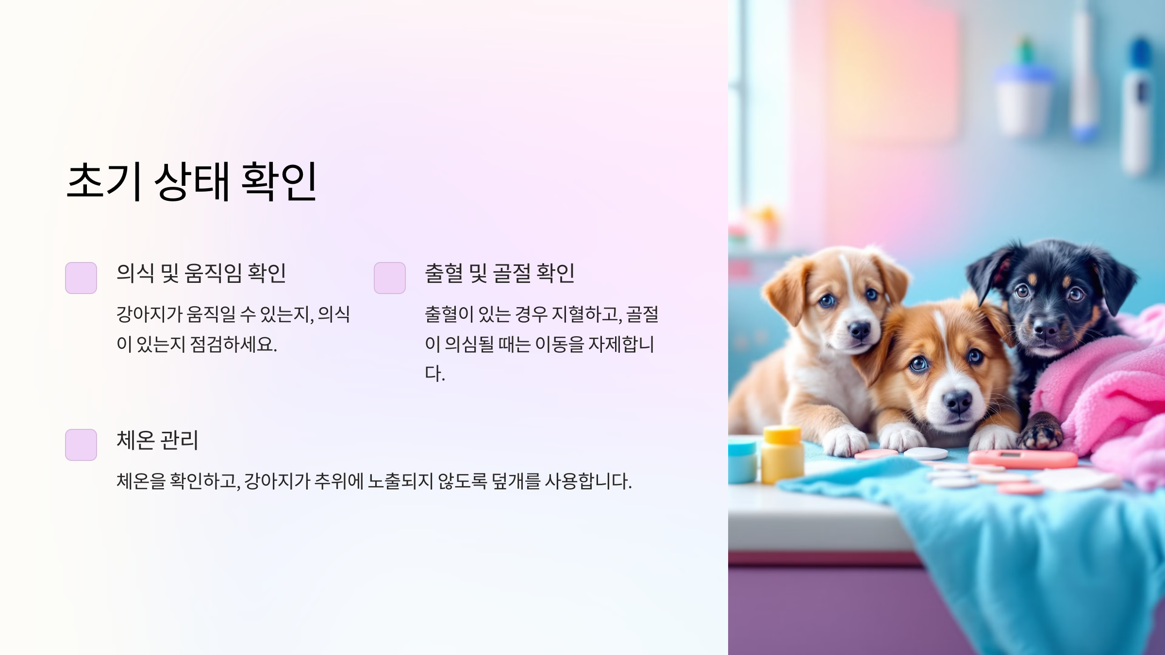 골절이 의심되는 경우, 강아지를 함부로 움직이지 않도록 조심해야 합니다. 골절 부위를 더 심하게 손상시킬 수 있으므로 강아지를 안거나 들 때 주의가 필요합니다. - 강아지의 심박수 및 호흡 상태 확인