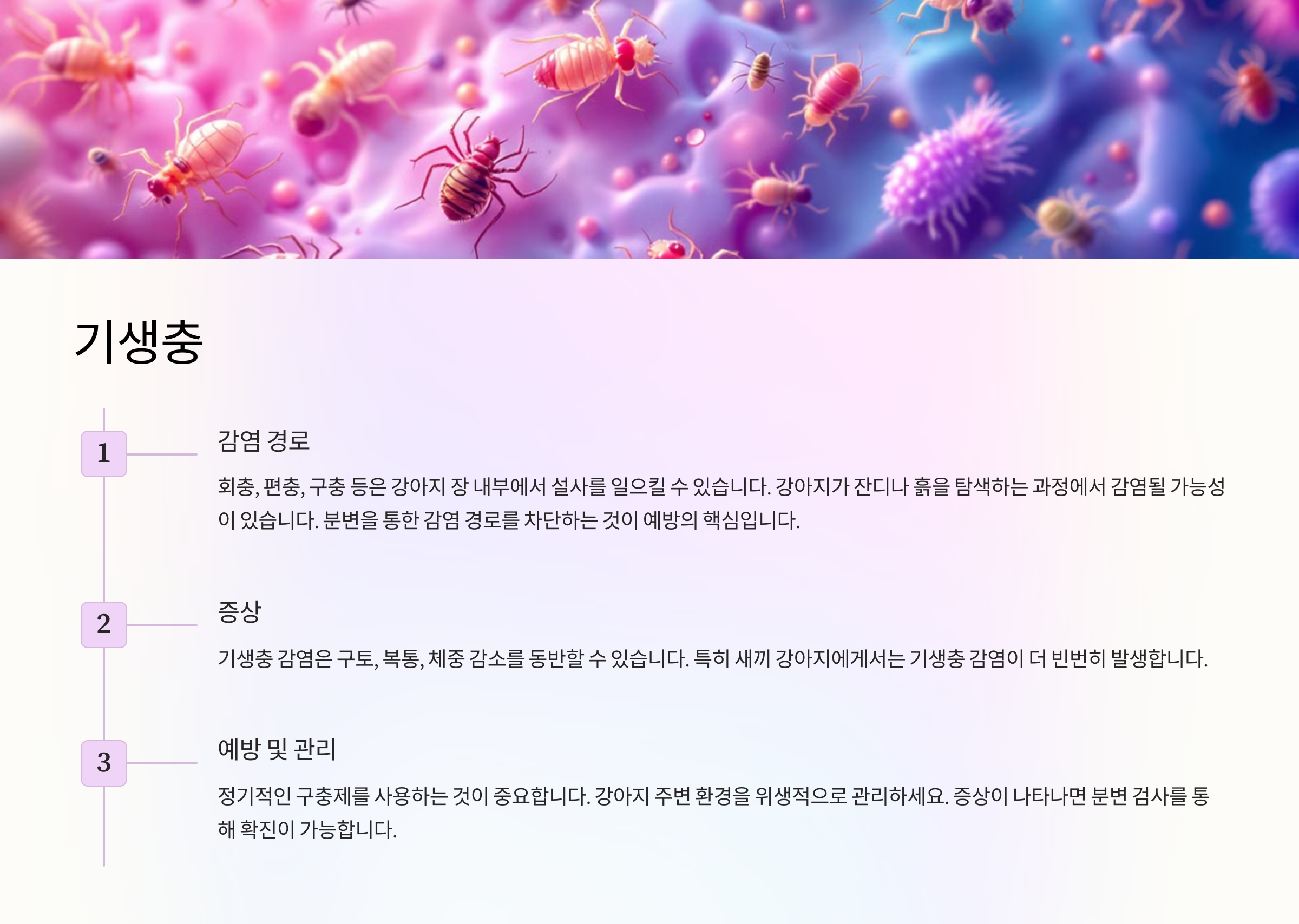 새끼 강아지는 면역체계가 약해 기생충 감염에 더 취약하므로, 특별한 주의가 필요합니다. 감염된 경우 신속히 치료하고, 감염 이후에도 주기적인 검사를 통해 건강 상태를 점검해야 합니다.