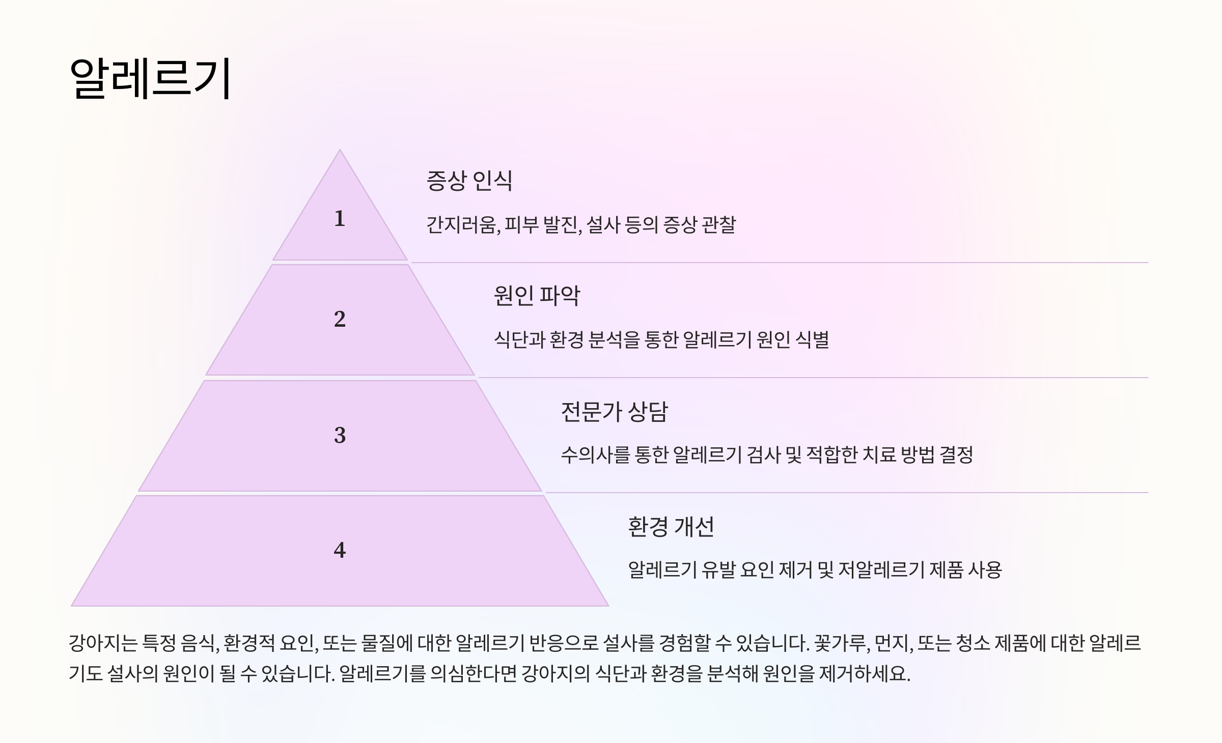 만약 강아지가 알레르기 증상을 보인다면, 가장 먼저 식단과 주변 환경을 분석하여 원인을 찾아 제거하는 것이 중요합니다. 수의사를 통해 알레르기 검사를 받아 강아지에게 적합한 치료 계획을 세우는 것도 추천됩니다. 강아지에게 저알레르기 사료를 제공하고, 알레르기를 유발할 수 있는 간식이나 특정 환경 요인을 피하는 것이 설사를 예방하는 효과적인 방법입니다.