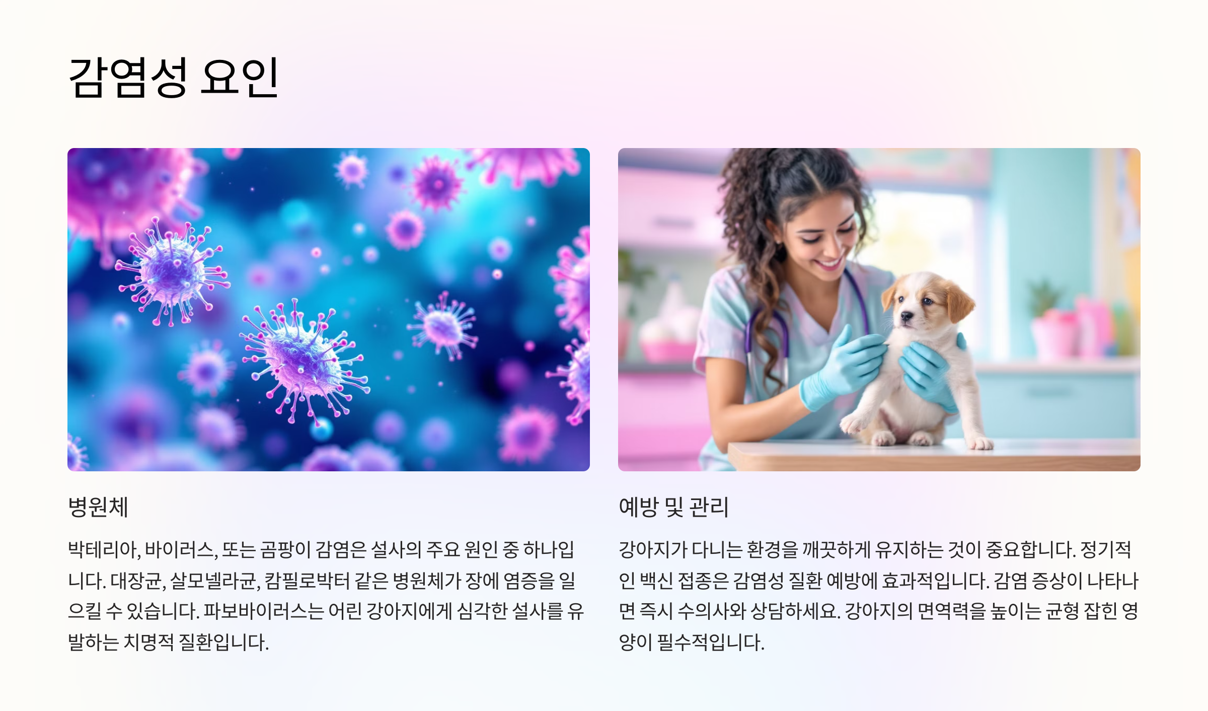 강아지의 건강을 유지하려면 환경을 깨끗하게 유지하고, 정기적인 백신 접종을 통해 질병을 예방하는 것이 필수입니다. 또한, 감염 초기 증상을 빠르게 알아차리고 수의사의 도움을 받는 것이 중요합니다. 강아지의 면역력을 높이기 위해 균형 잡힌 식단과 적절한 영양소 공급을 지속적으로 관리해야 합니다.