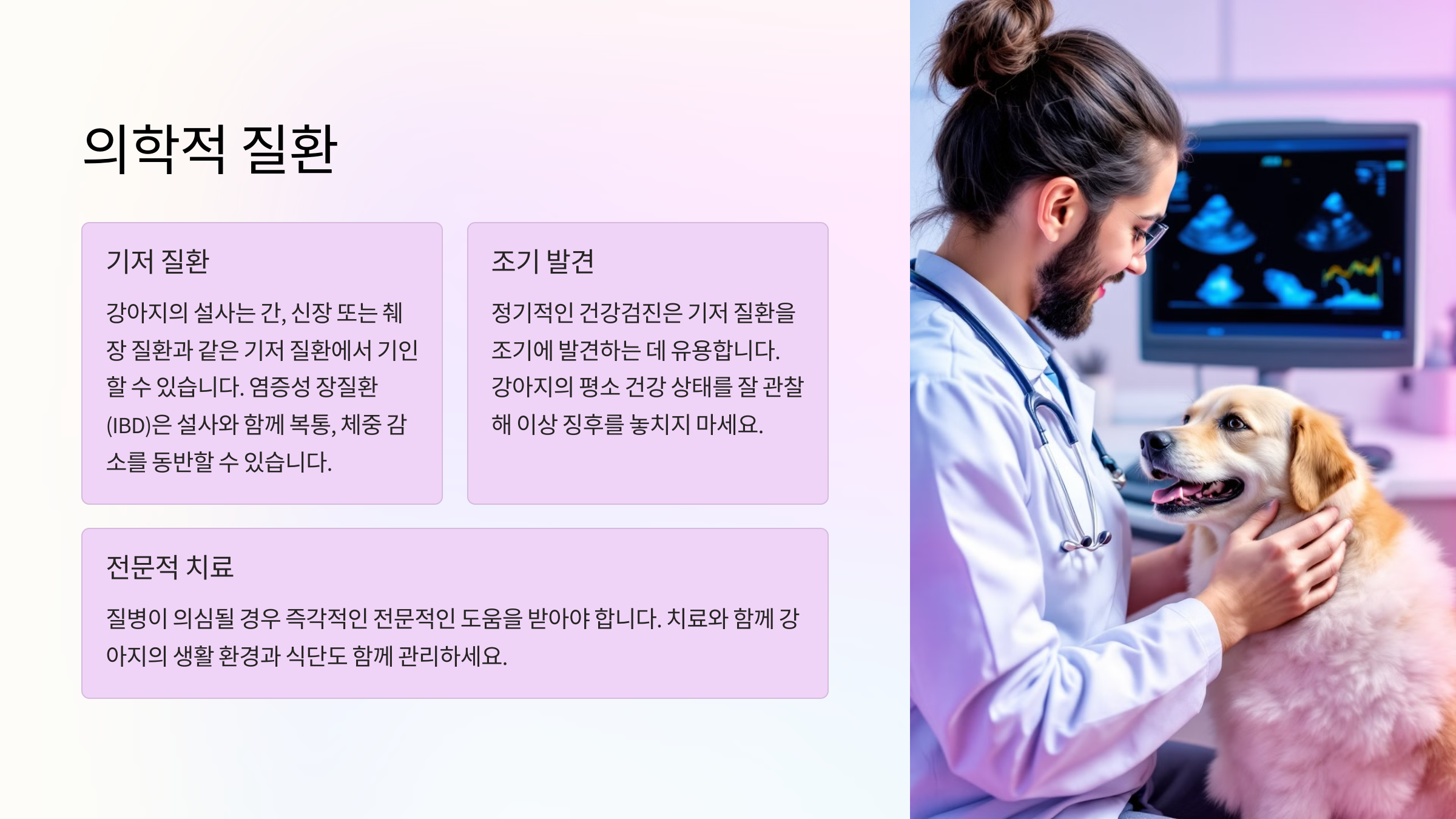 장기적인 설사 증상이 있다면 반드시 수의사를 통해 정밀 검사를 받고, 기저 질환의 근본 원인을 확인해야 합니다. 질환이 발견되면 수의사의 지시에 따라 치료를 시작하고, 강아지의 생활 환경과 식단을 철저히 관리해야 합니다. 정기적인 건강검진을 통해 초기 증상을 발견하고 조기 치료를 받는 것이 강아지의 건강을 유지하는 데 중요합니다.