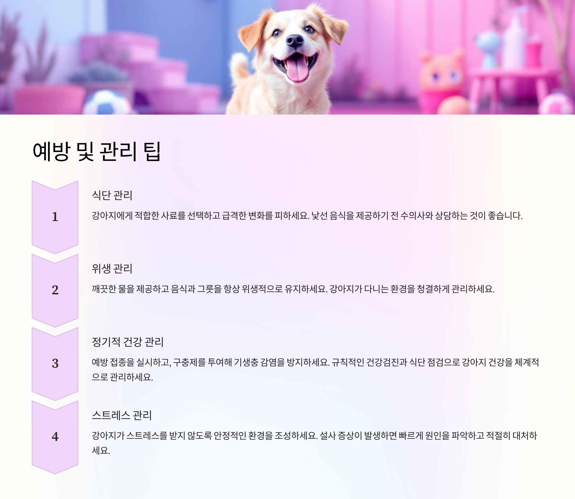 강아지가 낯선 음식을 먹어야 하는 상황이라면 반드시 수의사와 상담한 후에 시도해야 합니다. 이는 특정 성분이 알레르기를 유발할 가능성을 줄이는 데 도움을 줍니다. 또한, 정기적인 건강검진과 식단 점검을 통해 강아지의 전반적인 건강 상태를 체계적으로 관리하세요. 설사 증상이 발생했을 때는 빠르게 원인을 파악하고 적절히 대처하는 것이 중요합니다.