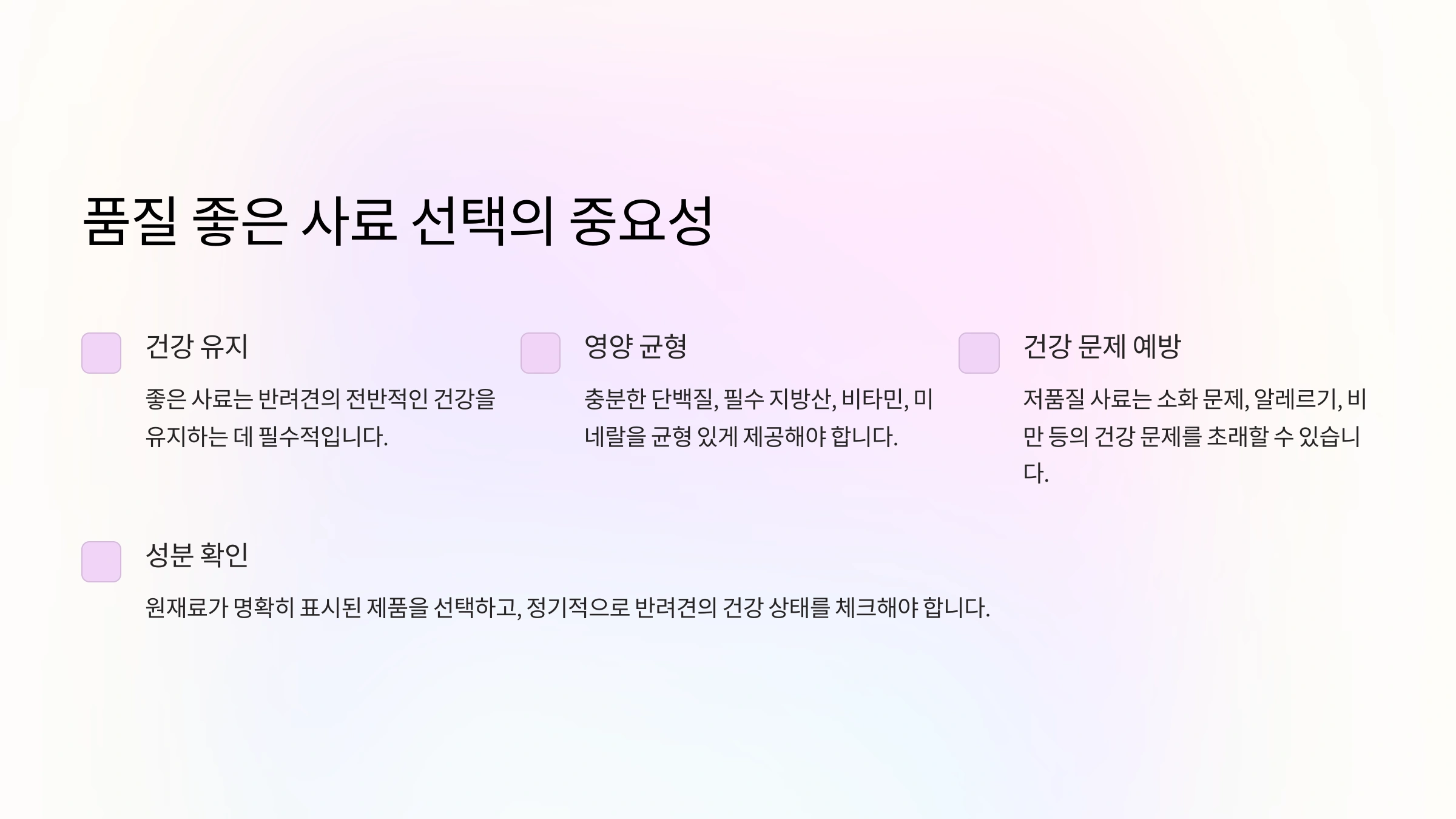 품질 좋은 사료는 단백질, 필수 지방산, 비타민, 미네랄 등 반려견의 건강 유지에 필요한 필수 영양소를 균형 있게 제공합니다. 이는 반려견의 성장과 발달을 돕고, 활동적이고 건강한 생활을 가능하게 합니다. 그러나 저품질 사료는 영양이 불균형하거나 화학적 보존제가 많아 소화 문제, 알레르기, 비만 등 다양한 건강 문제를 일으킬 수 있습니다.