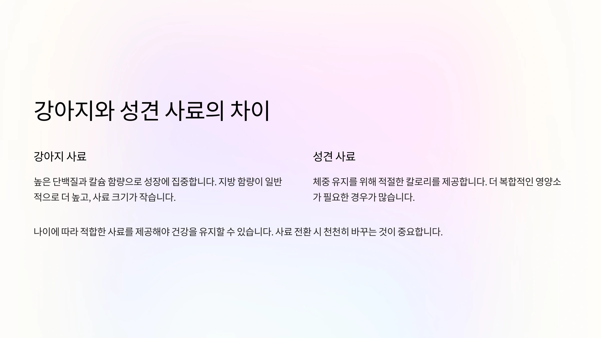 강아지 사료는 성장에 필요한 높은 단백질과 칼슘 함량을 가지고 있습니다. 이는 뼈와 치아의 발달, 근육 형성에 필수적입니다. 또한, 지방 함량도 강아지 사료가 더 높아 빠르게 성장하는 데 필요한 에너지를 공급합니다.