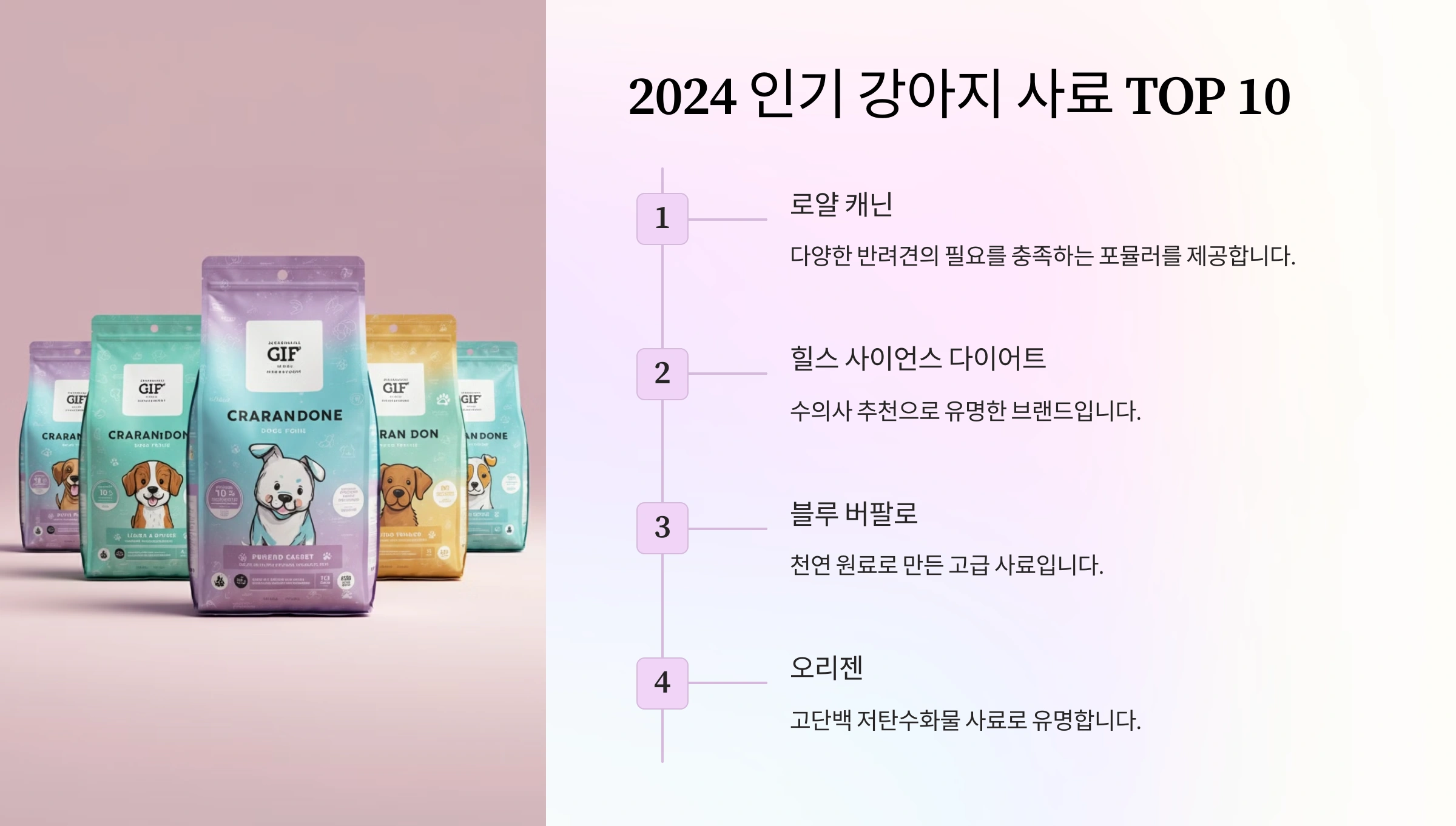 반려견의 건강을 위해 사료 선택은 매우 중요합니다. 2024년 최신 강아지 사료 추천 브랜드를 소개하며, 각각의 특징과 장단점을 상세히 안내합니다.