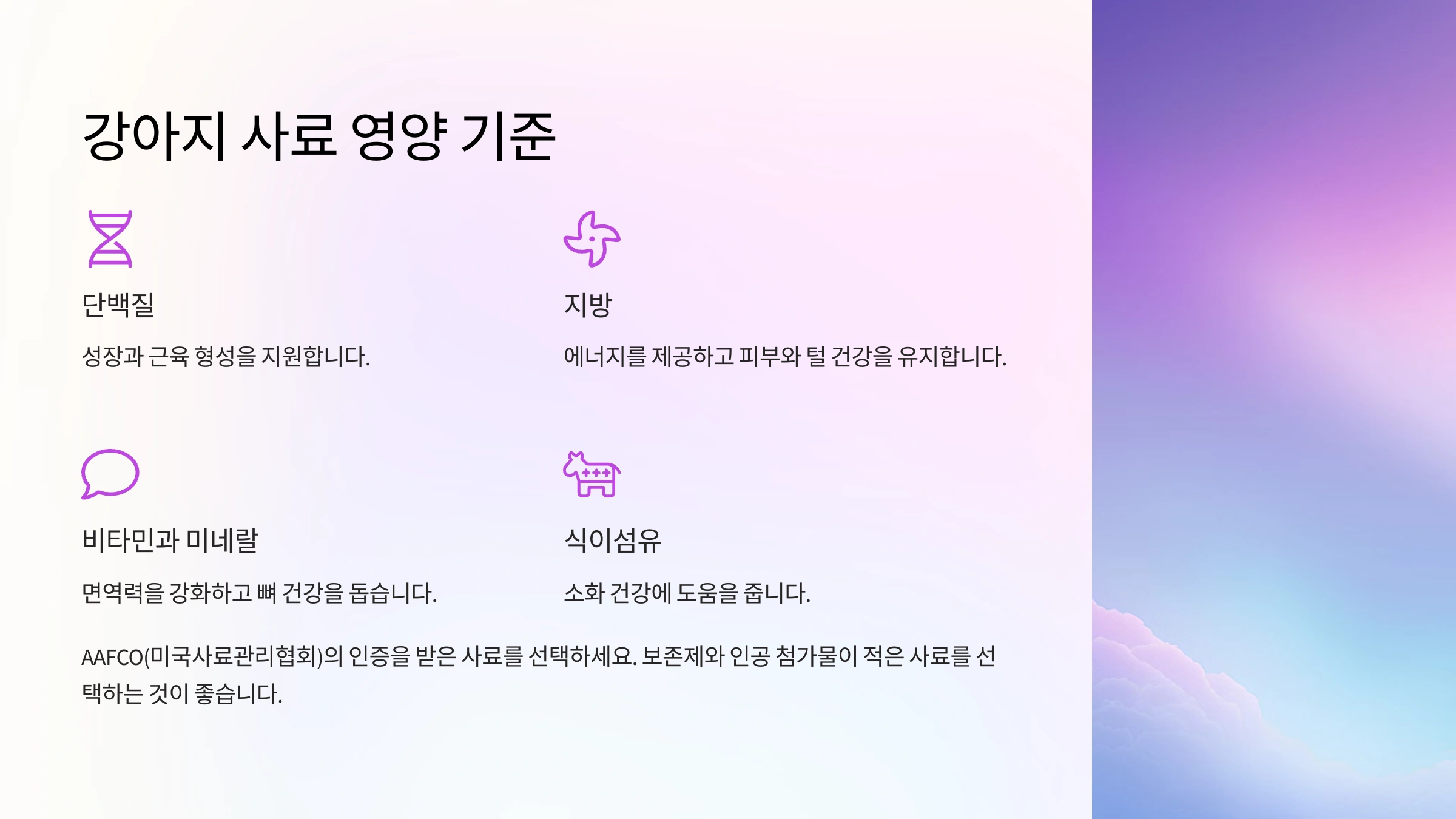 - 단백질: 반려견의 성장과 근육 형성에 필수적이며, 특히 강아지 시기에는 단백질 함량이 높은 사료를 선택하는 것이 중요합니다.