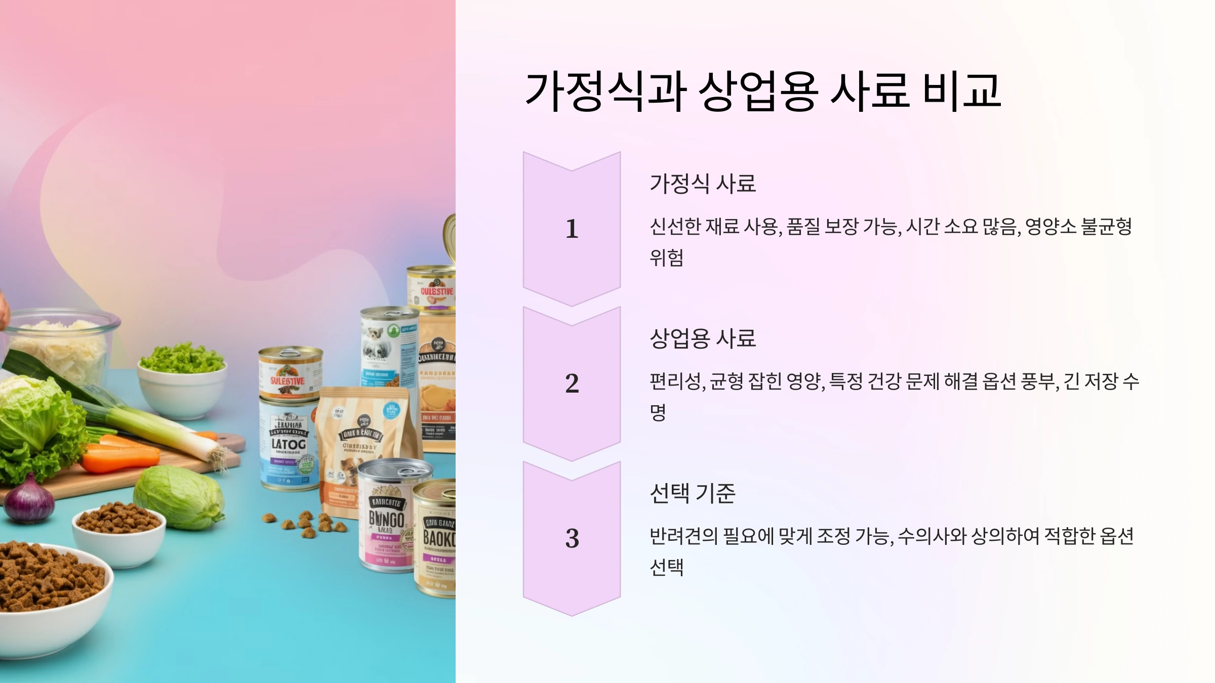가정식과 상업용 사료 모두 각각의 장단점이 있으므로, 반려견의 필요와 라이프스타일에 따라 적합한 옵션을 선택해야 합니다. 또한, 수의사와의 상담을 통해 영양소가 충분히 균형 잡힌 선택을 하는 것이 중요합니다.