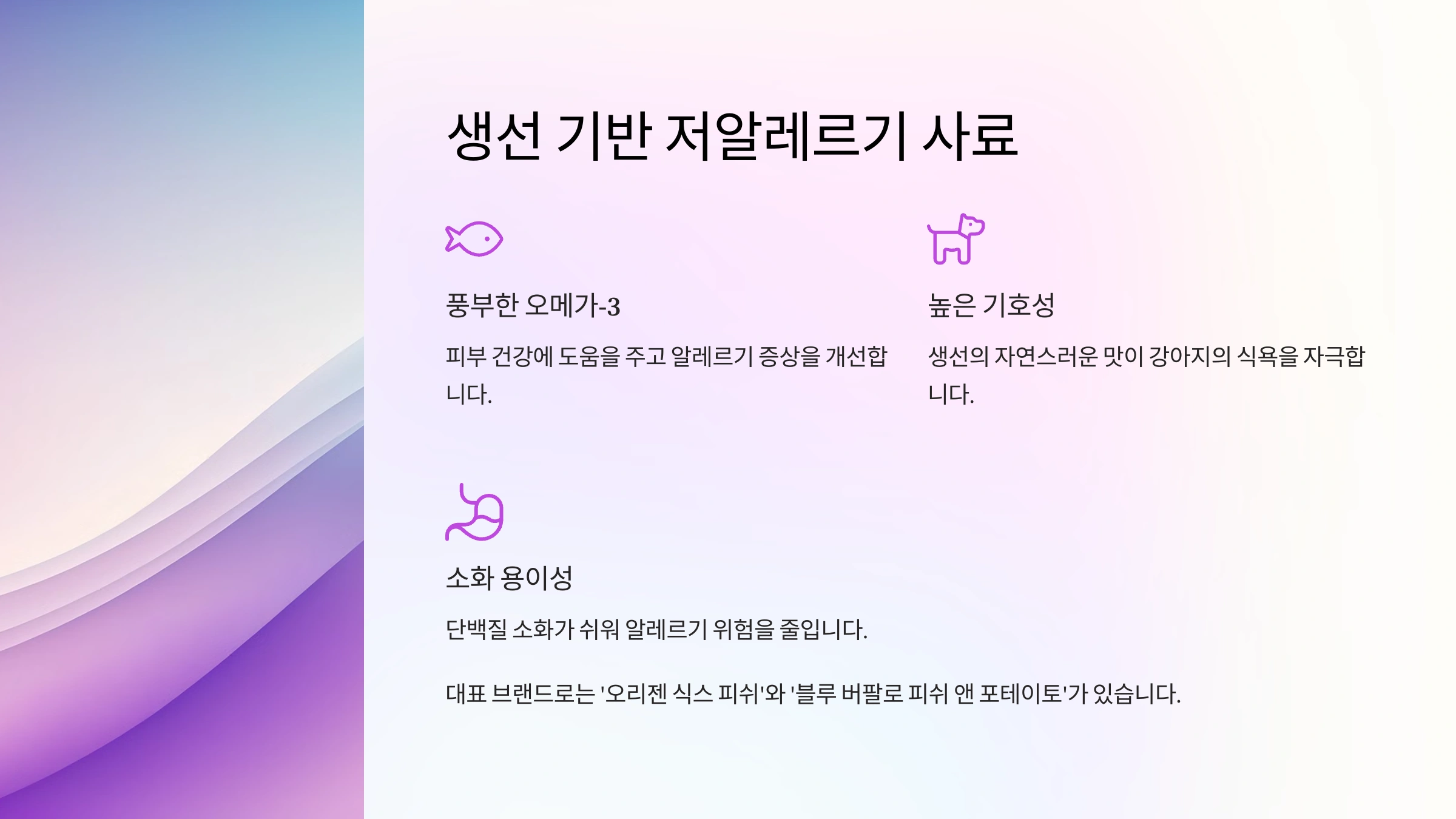 - 이러한 사료는 특히 위장이 약하거나 피부 알레르기가 심한 강아지에게 적합하며, 피부 및 털 건강에도 긍정적인 영향을 미칩니다.
