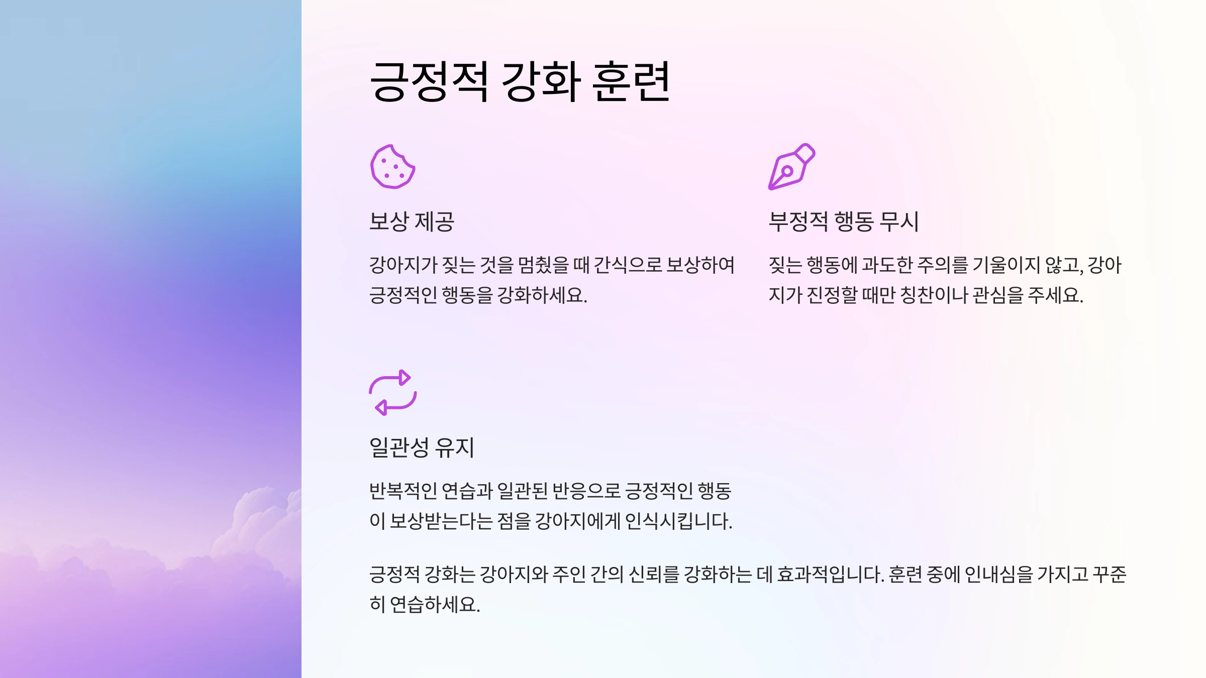 - 일관된 훈련: 훈련은 매일 같은 방식으로 반복적으로 이루어져야 합니다. 주인의 반응이 일관되지 않으면 강아지가 혼란을 느낄 수 있습니다.
