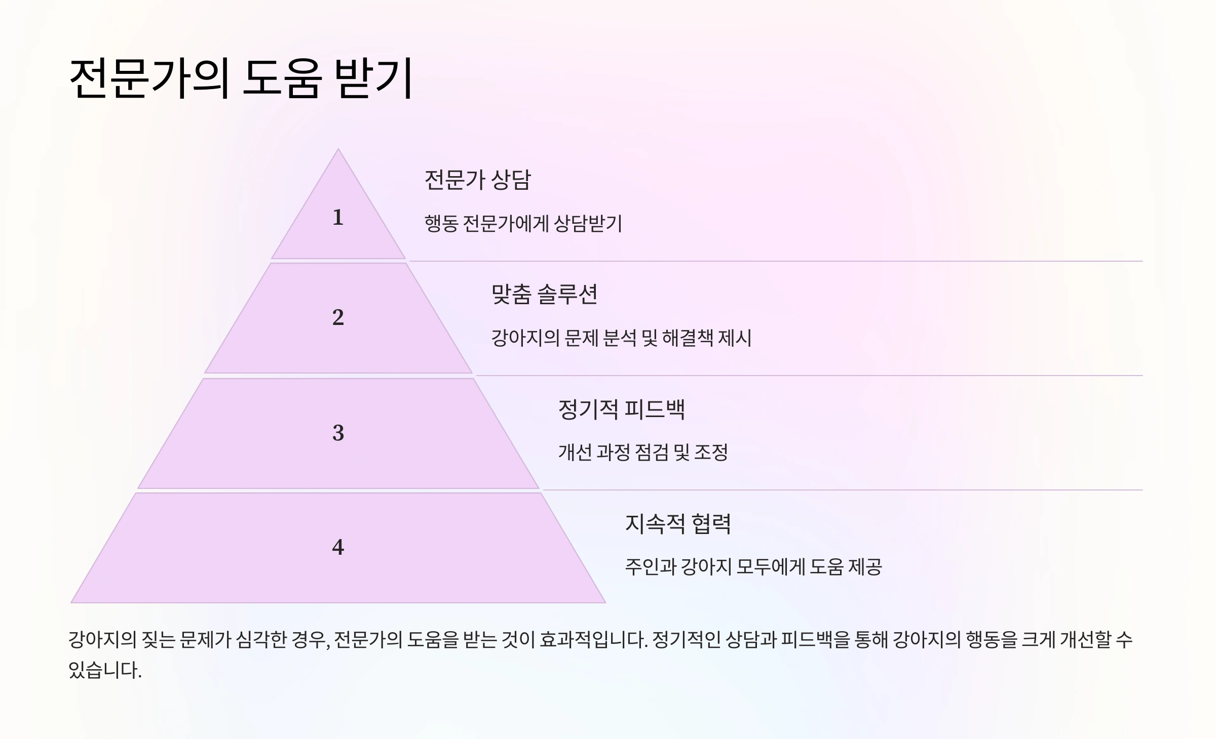 전문가의 도움은 주인과 강아지 모두에게 스트레스를 줄이고, 문제를 더 효율적으로 해결하는 데 큰 도움이 됩니다.