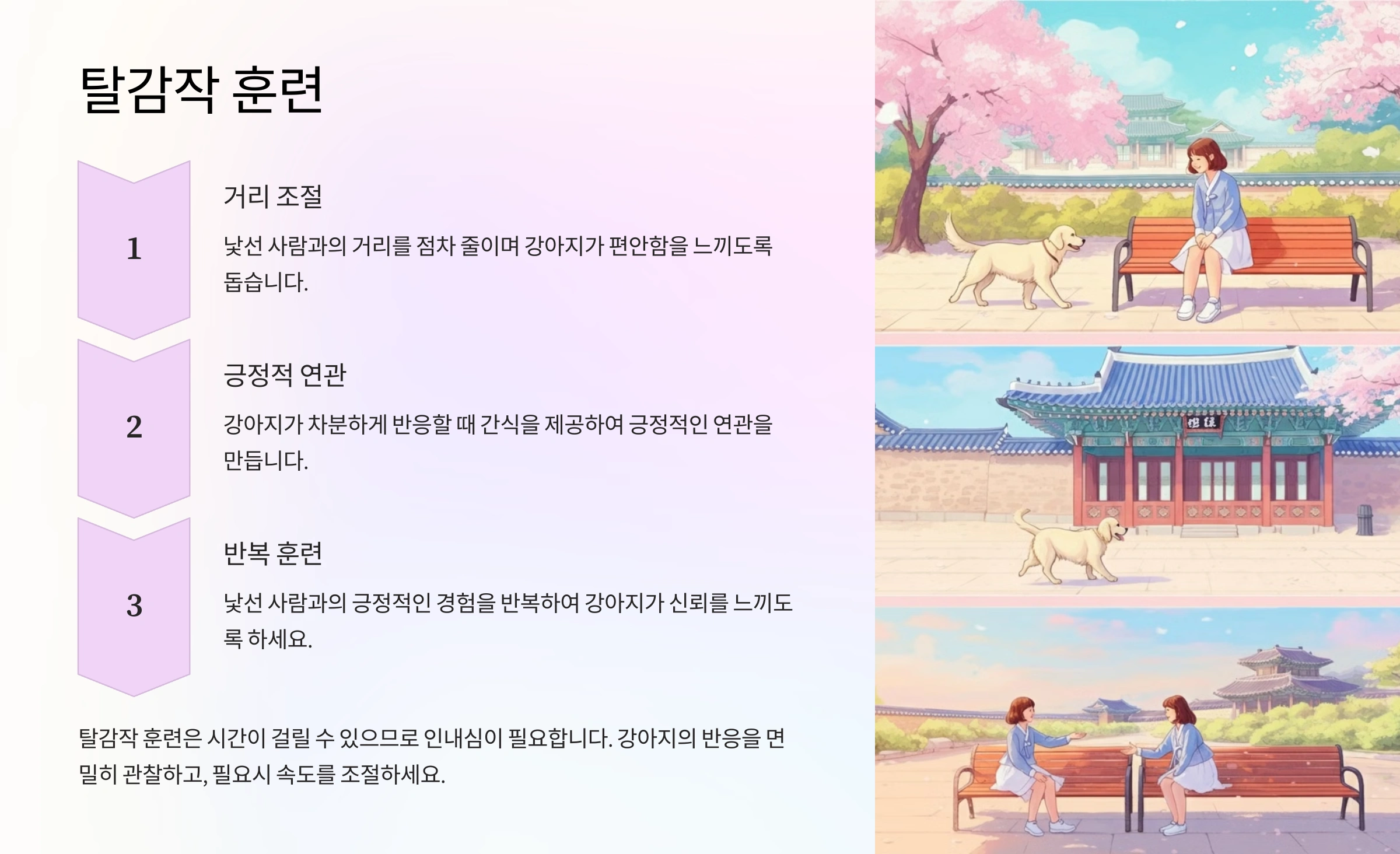 탈감작 훈련은 시간이 오래 걸릴 수 있으나, 강아지가 낯선 상황에 더 잘 적응하도록 도와줍니다. 특히 주인의 인내심과 꾸준한 노력이 필요합니다.