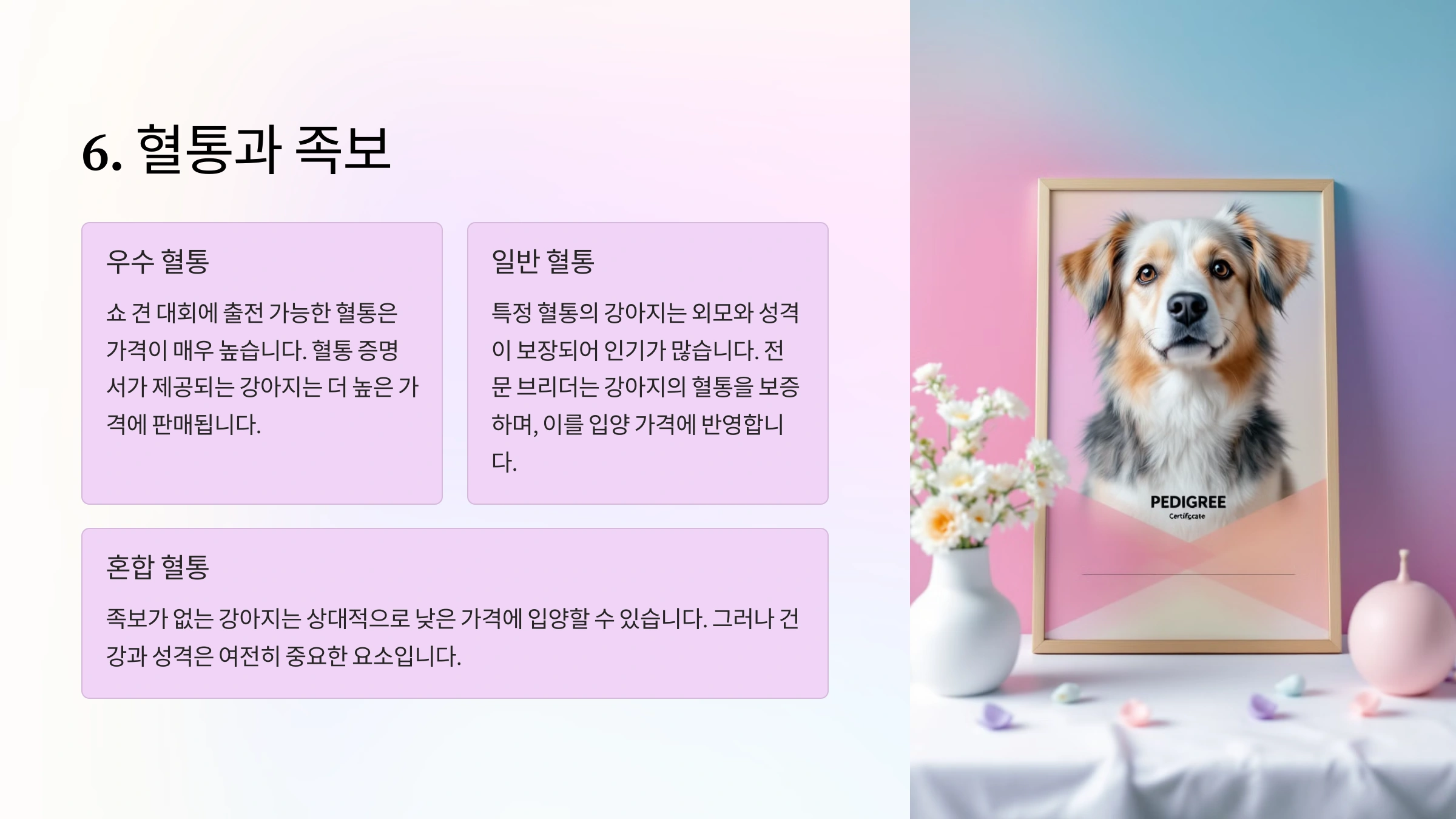 반면, 족보가 없는 강아지는 상대적으로 낮은 가격으로 입양될 수 있습니다. 그러나 족보가 없더라도 건강하고 사랑스러운 반려동물이 될 가능성은 충분하므로, 입양자가 자신의 우선순위를 명확히 정하는 것이 중요합니다.