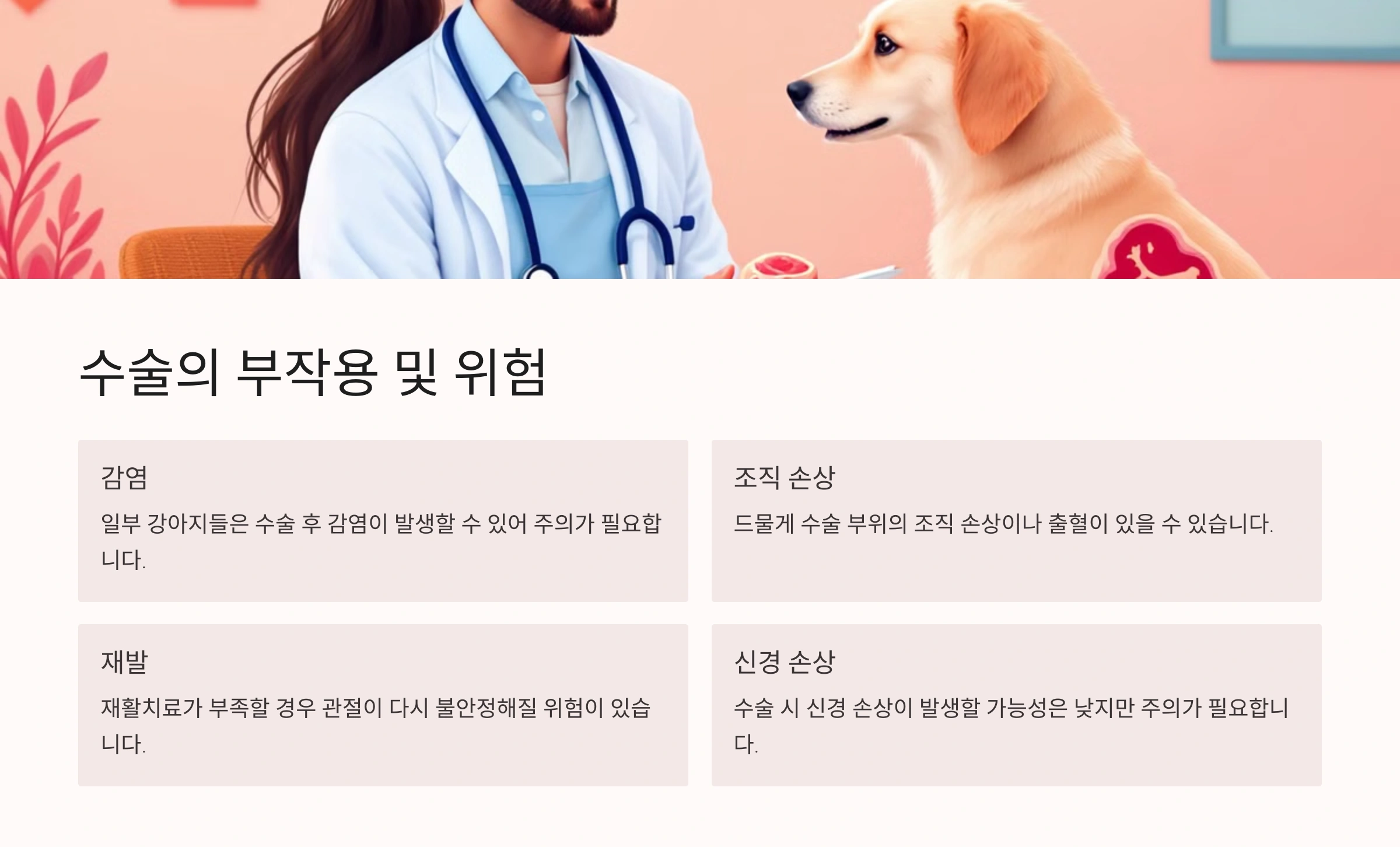 모든 수술에는 부작용과 합병증의 가능성이 있으며, 슬개골 탈구 수술도 예외는 아닙니다. 수술 후 가장 흔한 합병증은 감염입니다. 이를 방지하기 위해 수술 부위를 깨끗하게 유지하고, 약물 투여를 철저히 해야 합니다. 드물게 조직 손상이나 출혈이 발생할 수 있으므로, 수술 직후 강아지의 상태를 면밀히 관찰해야 합니다.