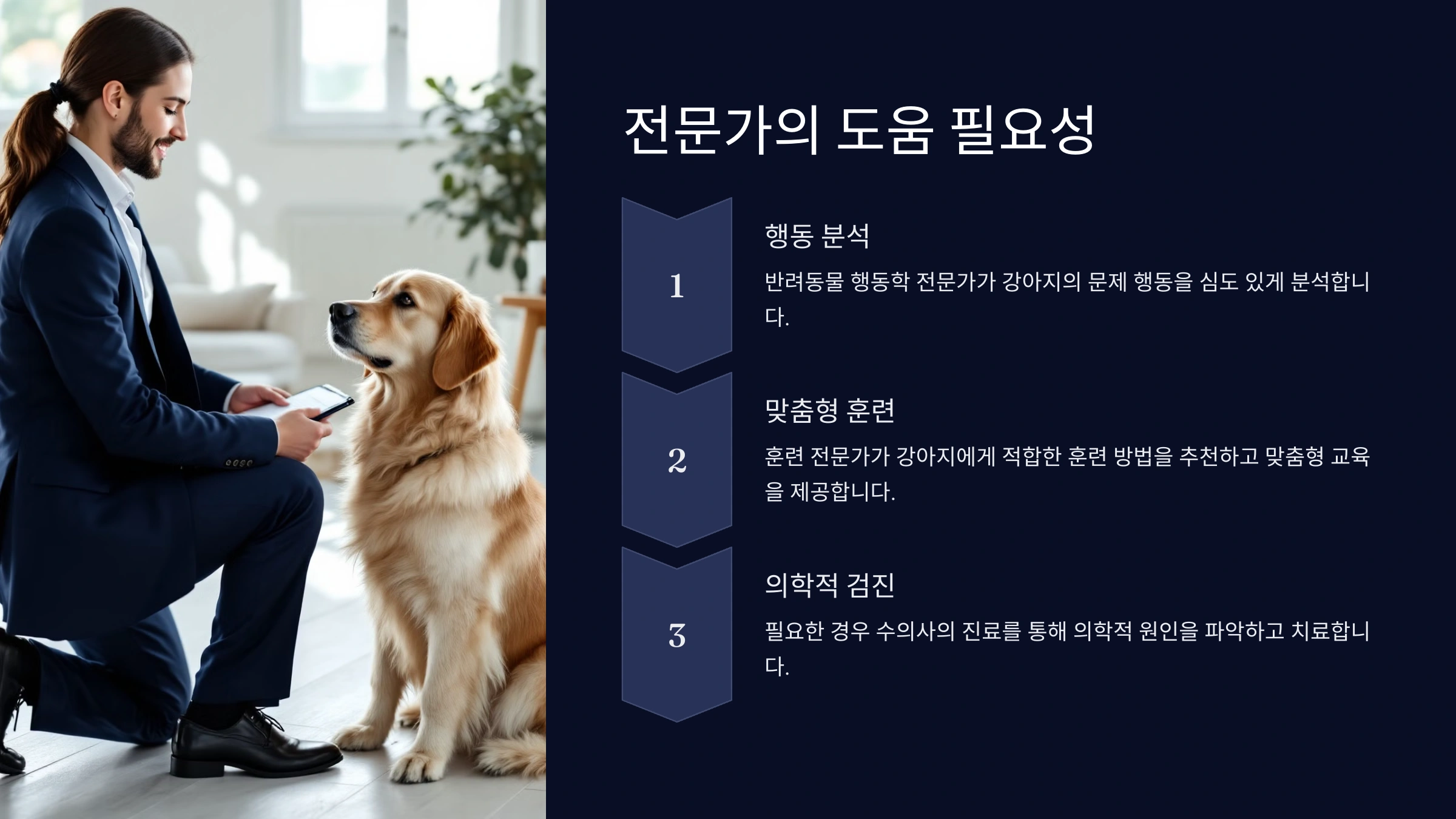 훈련 전문가가 강아지에게 적합한 훈련 방법을 추천합니다.