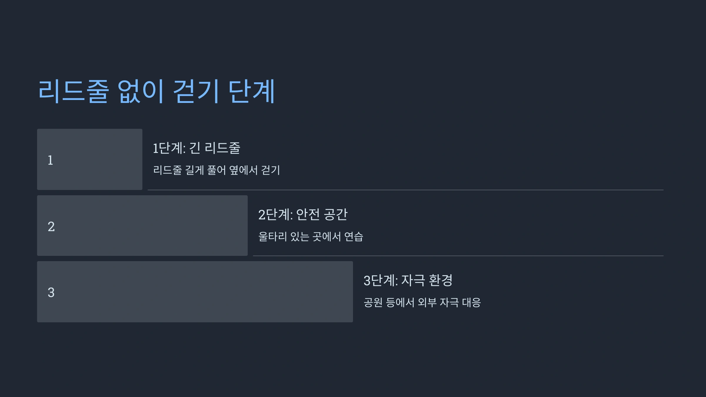 리드줄 없이 걷기 훈련은 단계별로 진행되어야 강아지가 자연스럽게 적응할 수 있어요. 첫 번째 단계는 리드줄을 길게 풀어주며 강아지가 주인의 옆을 걷도록 유도하는 거예요. 이 과정에서 "옆에"와 같은 명령어를 추가해주는 것도 효과적이에요.