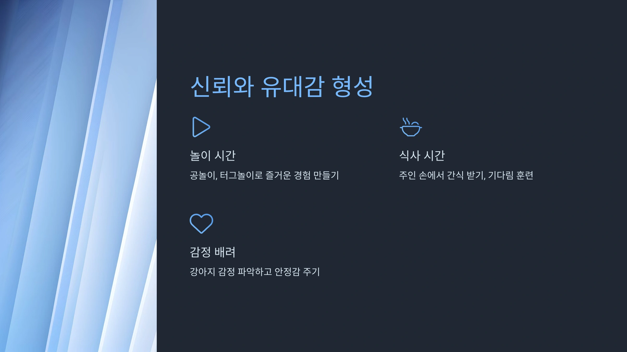 식사 시간도 신뢰 형성의 기회가 될 수 있어요. 강아지가 주인의 손에서 간식이나 사료를 받게 하거나, 기다려 명령 후 보상을 주는 방식을 활용하면 신뢰감이 크게 강화돼요. 특히 강아지가 주인을 지켜보는 행동이 자연스러워지도록 유도하는 것이 핵심이에요.