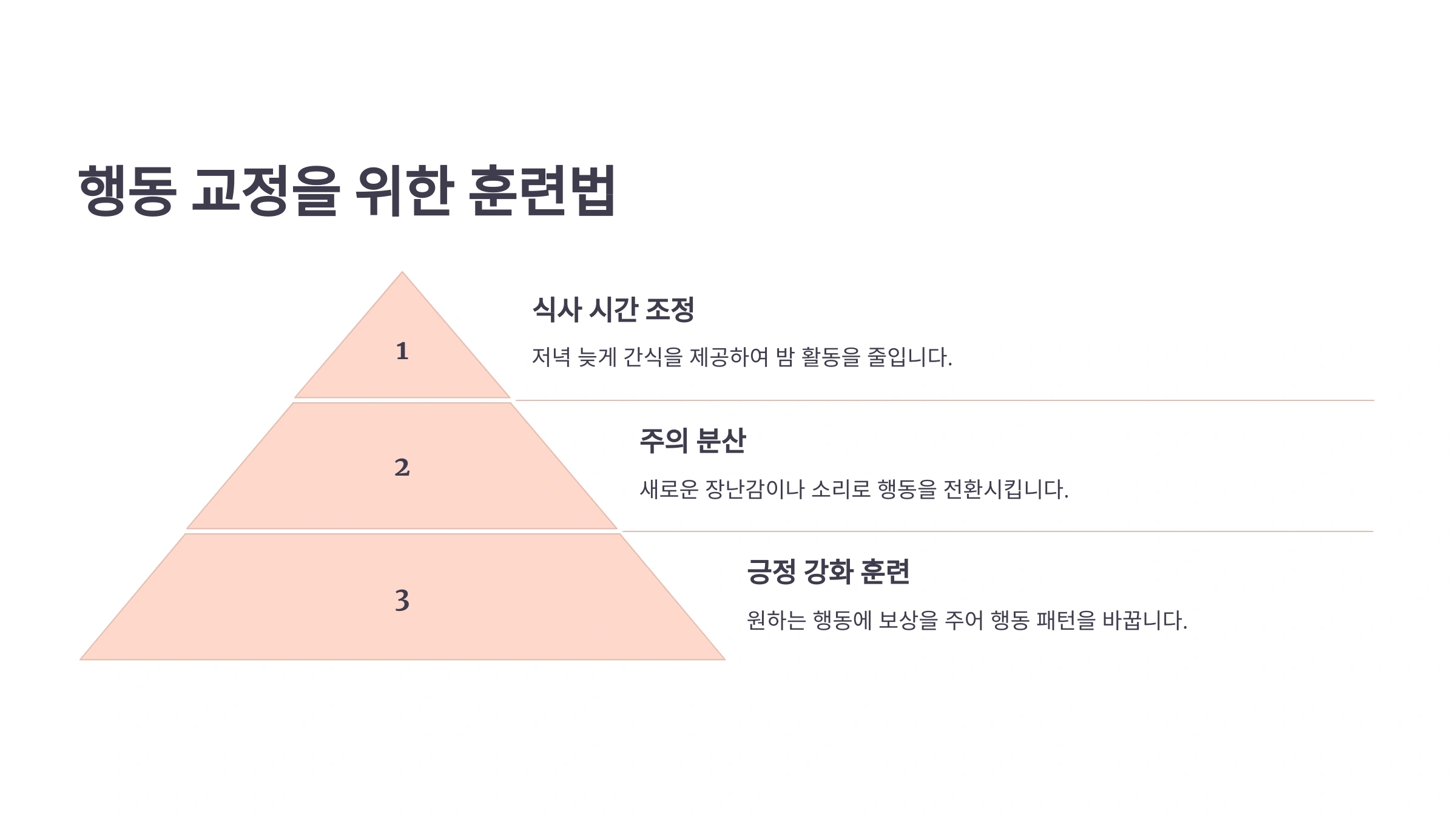 고양이의 야행성 행동을 교정하려면 인내심과 일관된 훈련이 필요해요. 첫 번째로, 고양이의 식사 시간을 조정해 보세요. 저녁 늦게 간식을 제공하면, 고양이가 포만감을 느껴 밤 활동을 줄이는 데 도움이 될 수 있어요.