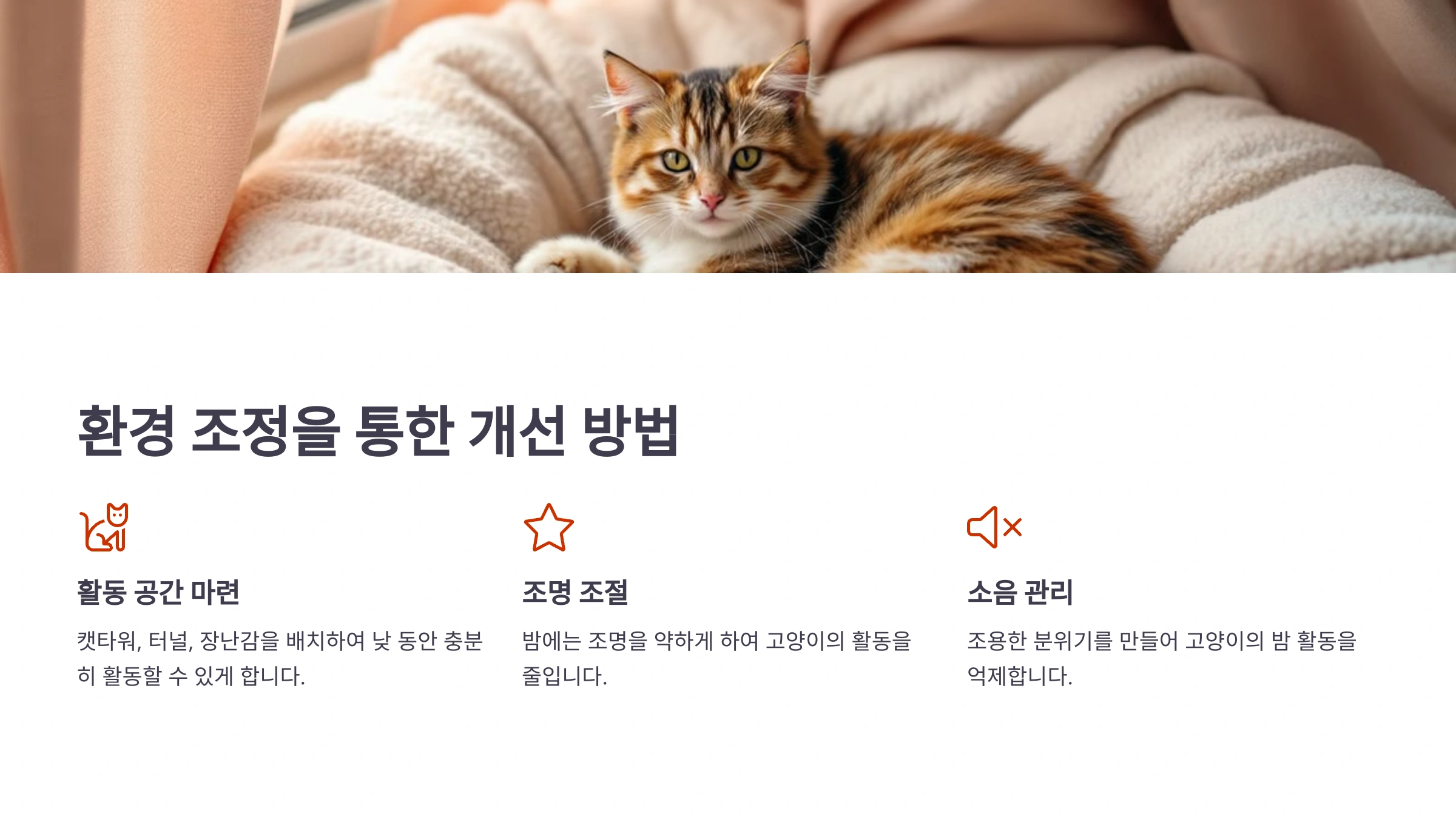 마지막으로, 고양이가 밤에 자율적으로 활동할 수 있는 환경을 조성하면서도, 자극이 너무 강하지 않게 설정해야 해요. 이러한 환경 조정은 고양이와 보호자 모두에게 편안함을 줄 수 있답니다.