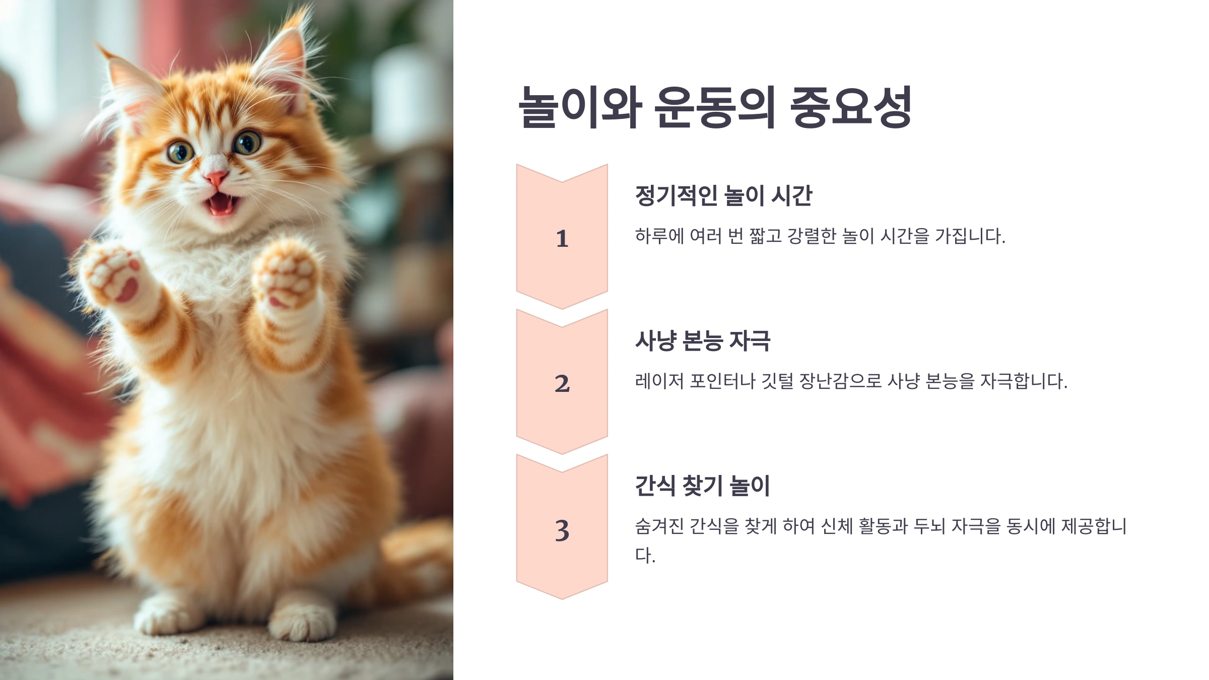 놀이와 운동은 고양이의 밤 활동성을 줄이는 데 가장 효과적인 방법이에요. 고양이는 하루에 몇 번씩 짧고 강렬한 놀이를 통해 에너지를 발산하는 것을 좋아해요. 특히, 레이저 포인터나 깃털 장난감은 고양이의 사냥 본능을 자극하면서 운동 효과도 줄 수 있답니다.