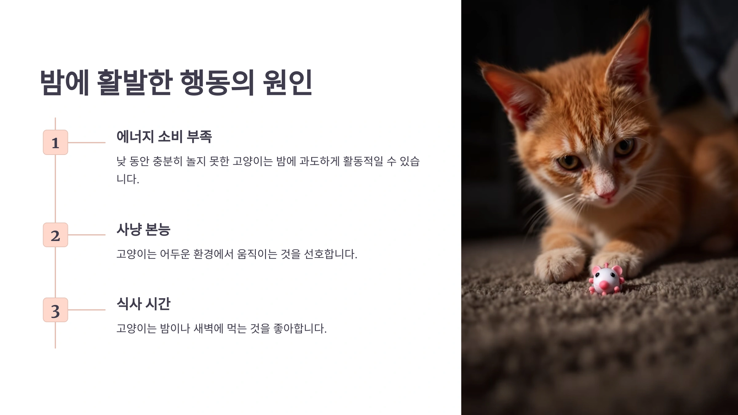 이 문제를 해결하기 위해서는 고양이의 건강 상태를 점검하고, 적절한 활동과 환경 개선을 통해 밤 활동성을 줄이는 것이 필요해요. 이 과정에서 보호자의 인내심과 일관된 관리가 중요하답니다.