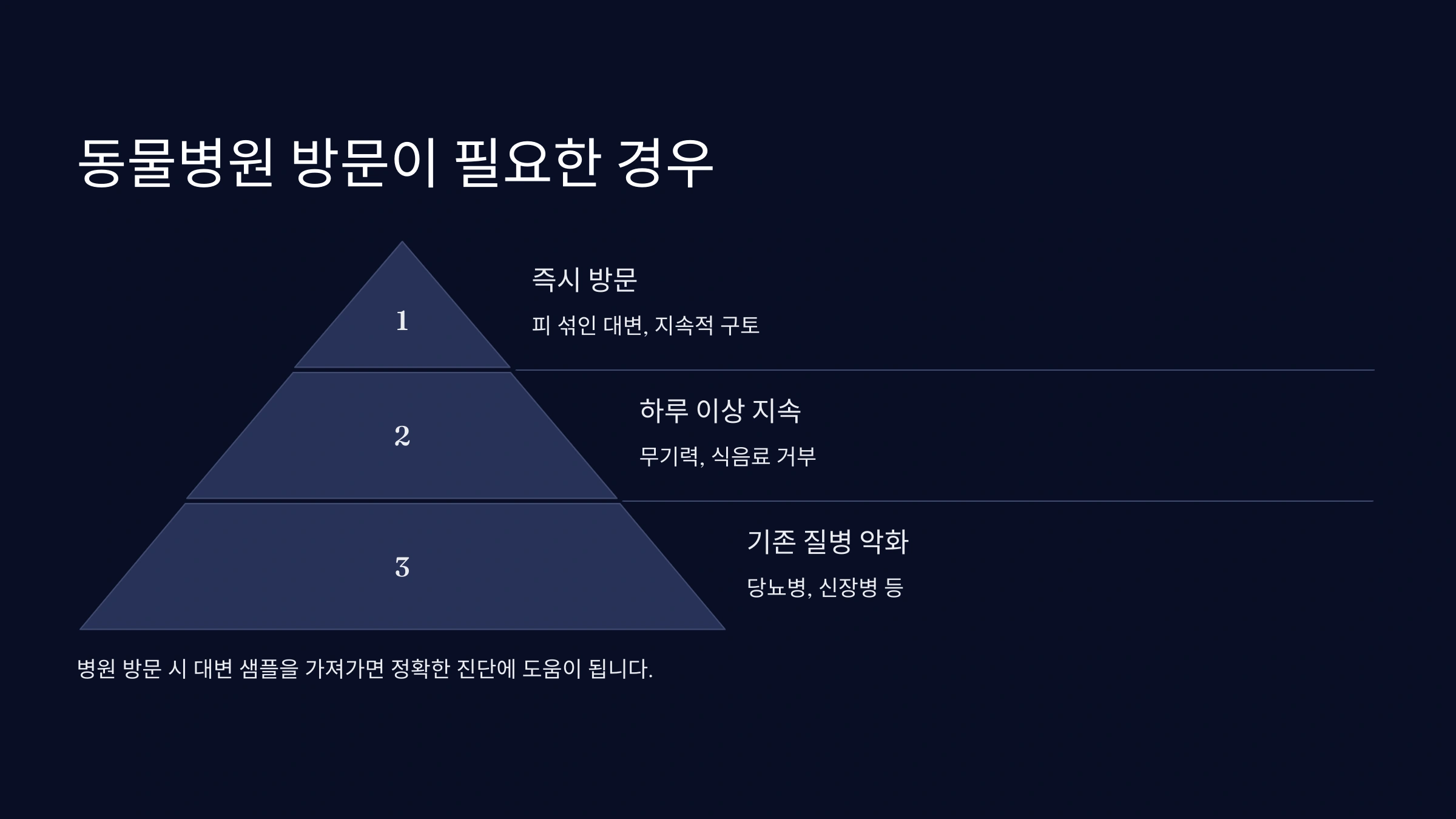 설사가 하루 이상 지속되거나, 고양이가 무기력해지고 먹거나 마시는 것을 거부한다면 즉시 동물병원을 방문해야 해요. 특히 대변에 피가 섞이거나 점액이 보일 경우에는 심각한 건강 문제의 신호일 수 있답니다.
