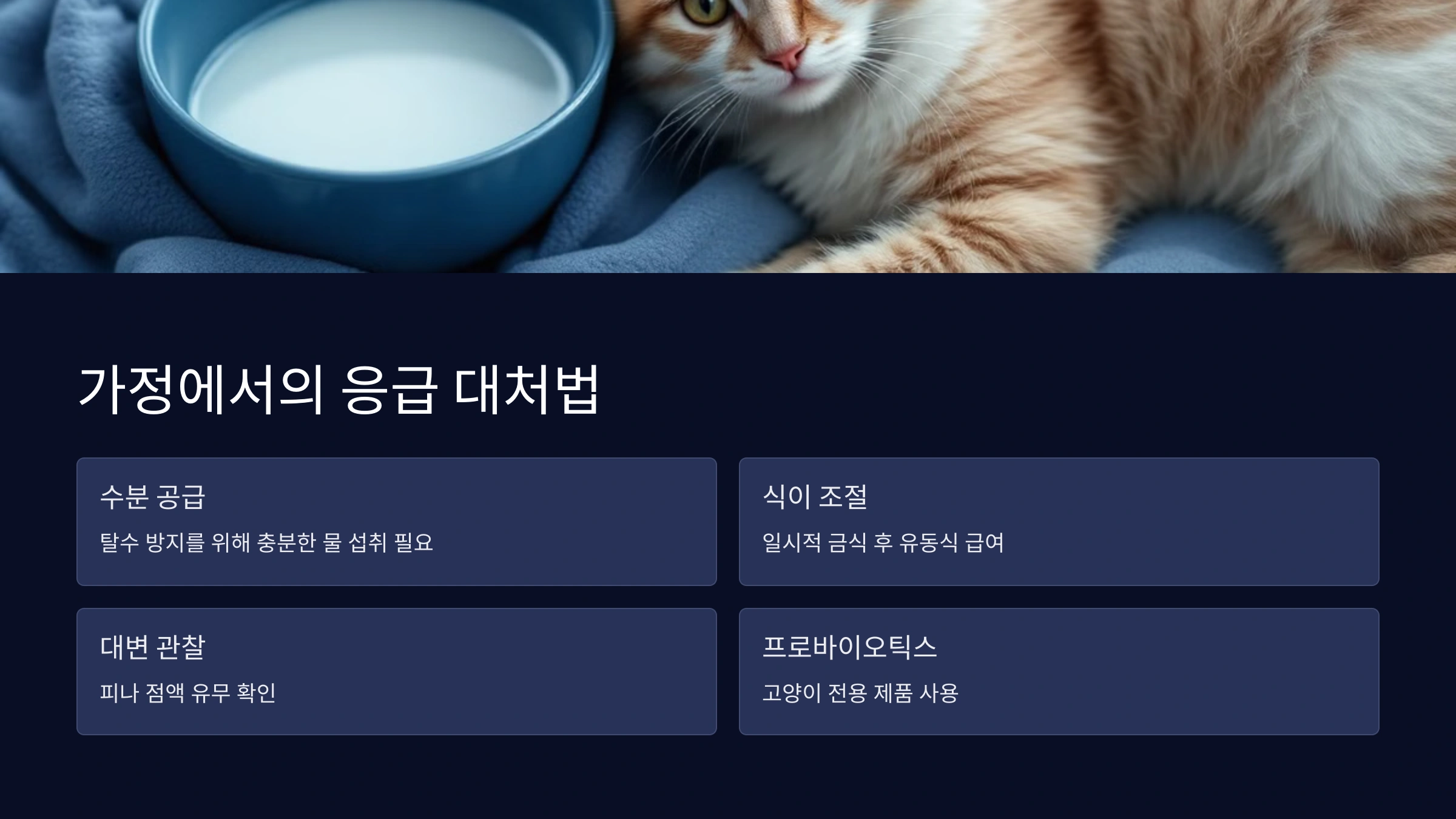 응급 상황에서는 정제된 프로바이오틱스를 사용할 수도 있어요. 이는 장내 유익균을 늘려 고양이의 장 건강을 빠르게 회복시킬 수 있답니다. 다만, 사람용 제품이 아닌 고양이 전용 제품을 사용하는 것이 중요해요.