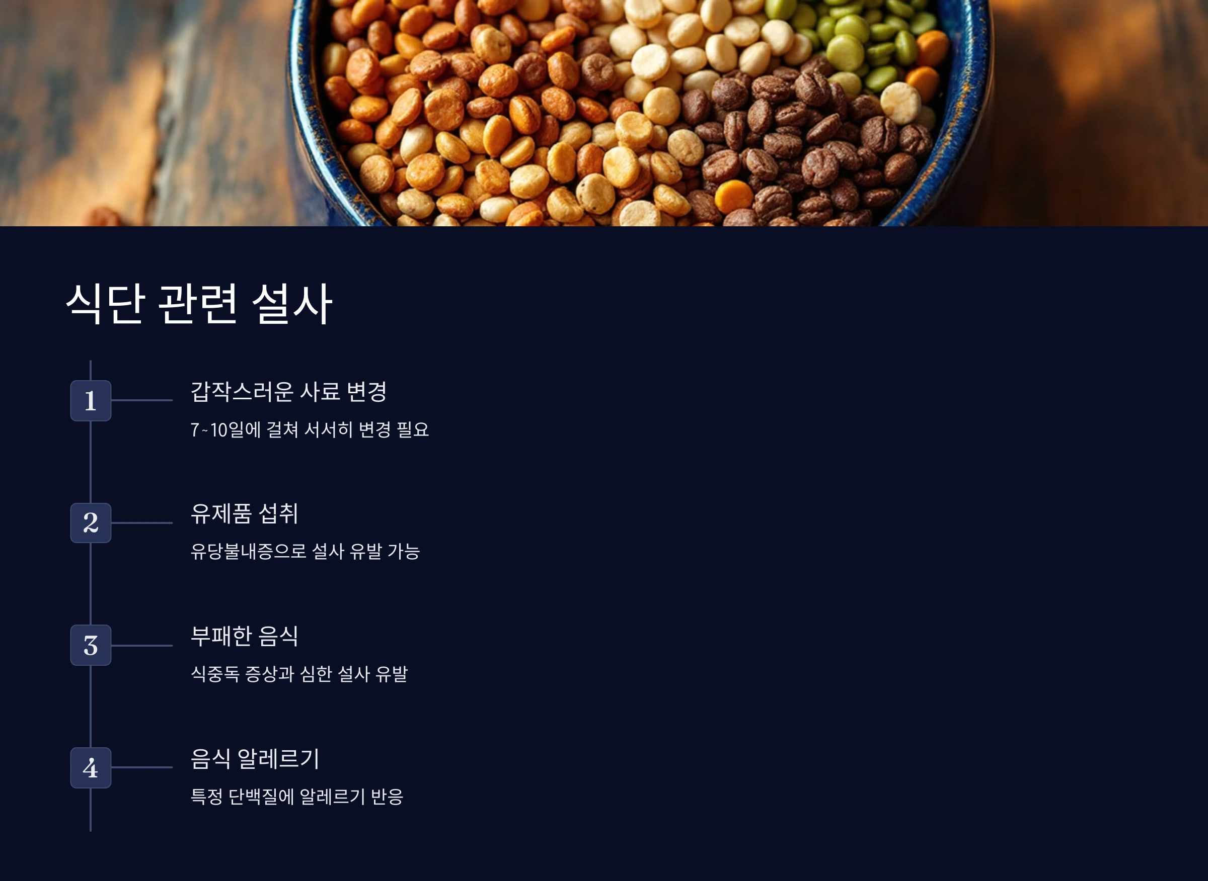 고양이의 식단은 설사의 원인으로 매우 흔하게 작용해요. 예를 들어, 새로운 사료로 갑작스럽게 바꾸면 장이 적응하지 못해 설사가 발생할 수 있답니다. 식단 변경은 7~10일에 걸쳐 서서히 진행해야 해요.