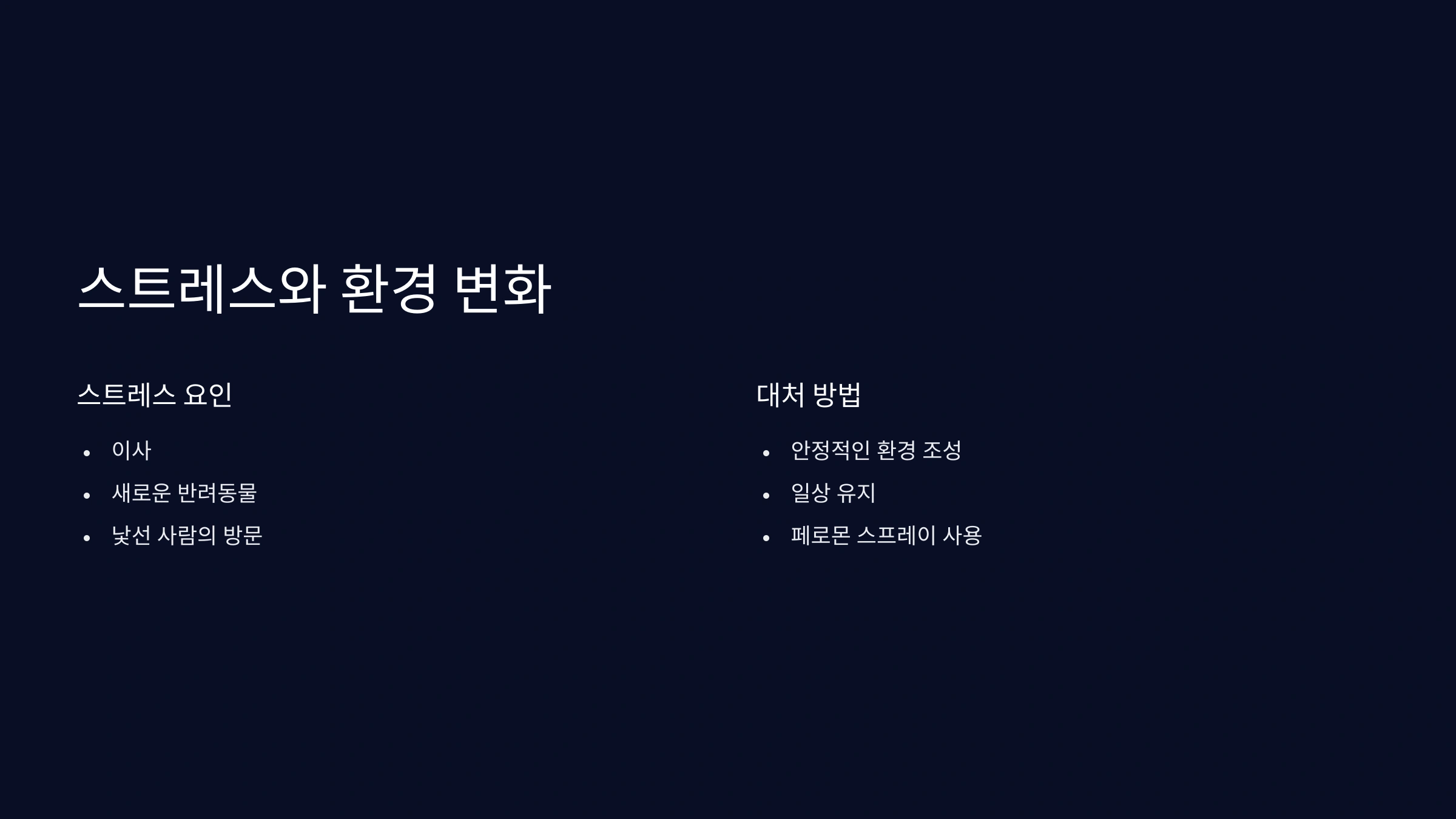고양이의 불안을 완화하려면 페로몬 스프레이나 진정 효과가 있는 제품을 사용하는 것도 좋은 방법이에요. 또한, 충분한 놀이 시간과 애정을 주는 것도 스트레스를 줄이는 데 큰 도움이 돼요.