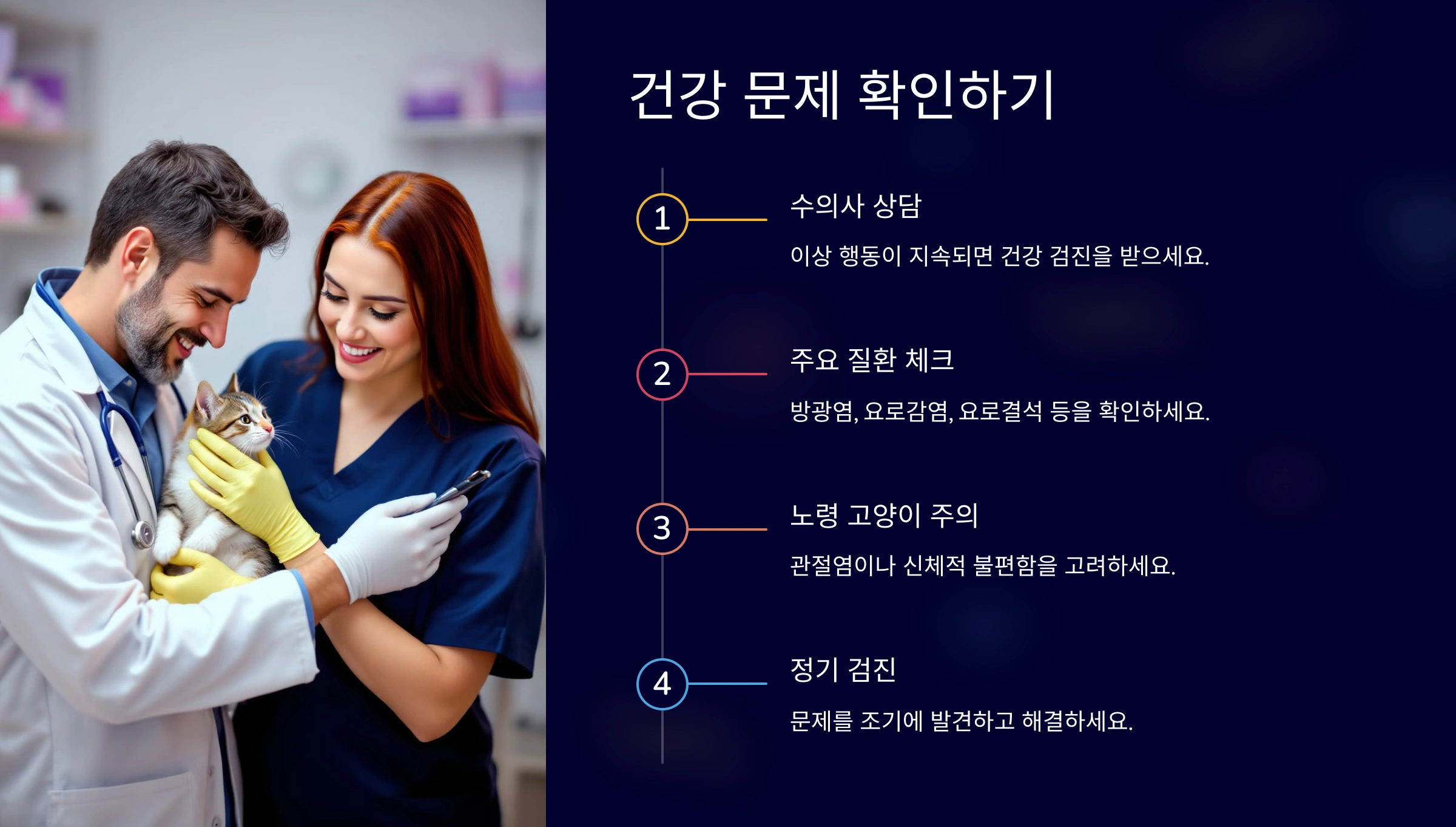 정기적인 건강 검진은 문제를 조기에 발견하고 해결하는 데 도움을 줄 거예요. 고양이의 평소 행동과 다른 점이 보이면 주의 깊게 관찰하고 필요 시 전문가의 도움을 받는 것이 중요해요.