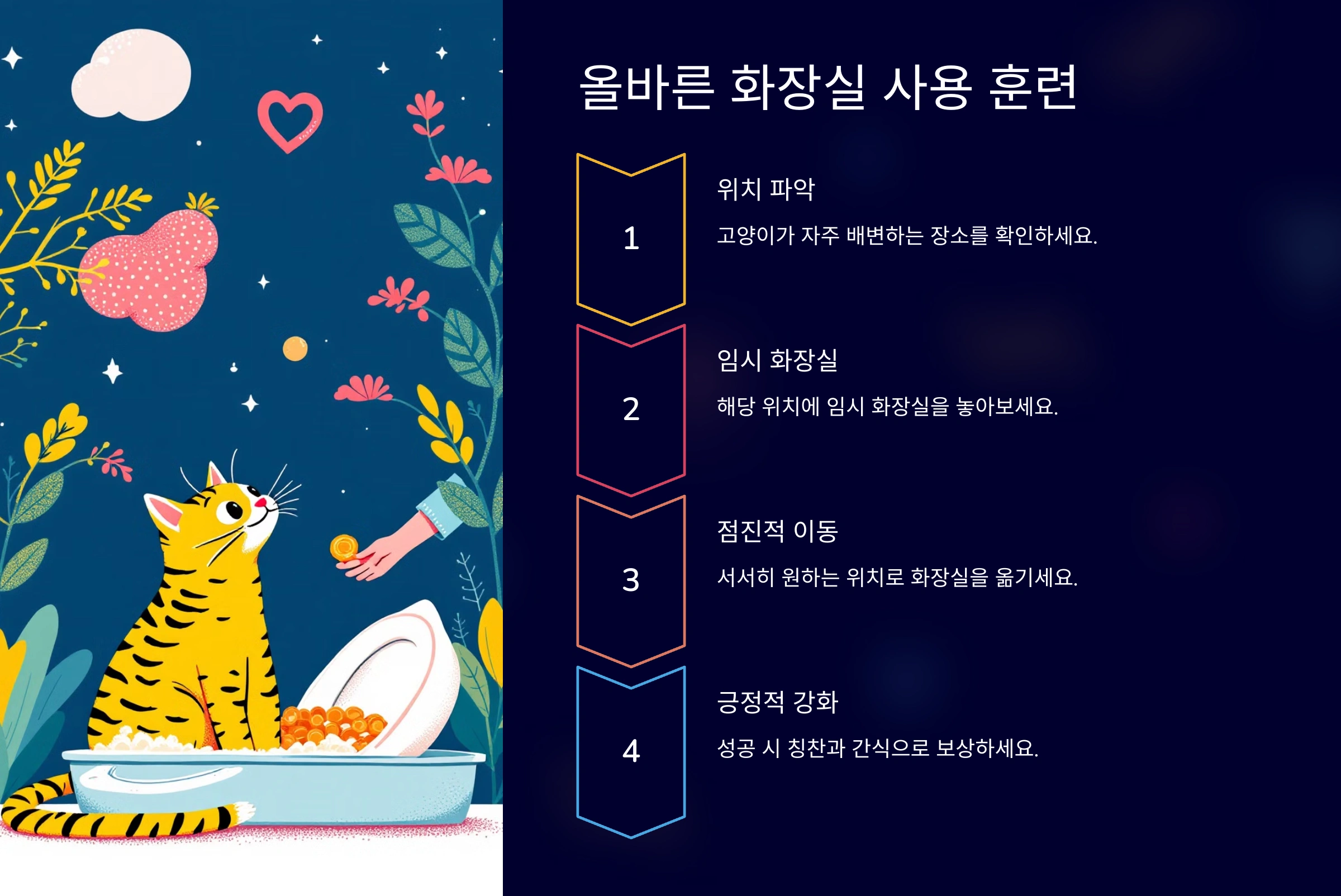 고양이가 화장실을 바르게 사용하는 습관을 들이는 훈련은 인내심과 꾸준함이 필요해요. 가장 먼저 고양이가 자주 배변하는 장소를 파악하고, 그 자리에 임시로 화장실을 놓아보세요. 이후 서서히 화장실을 원하는 위치로 옮겨가는 방법도 효과적이에요.