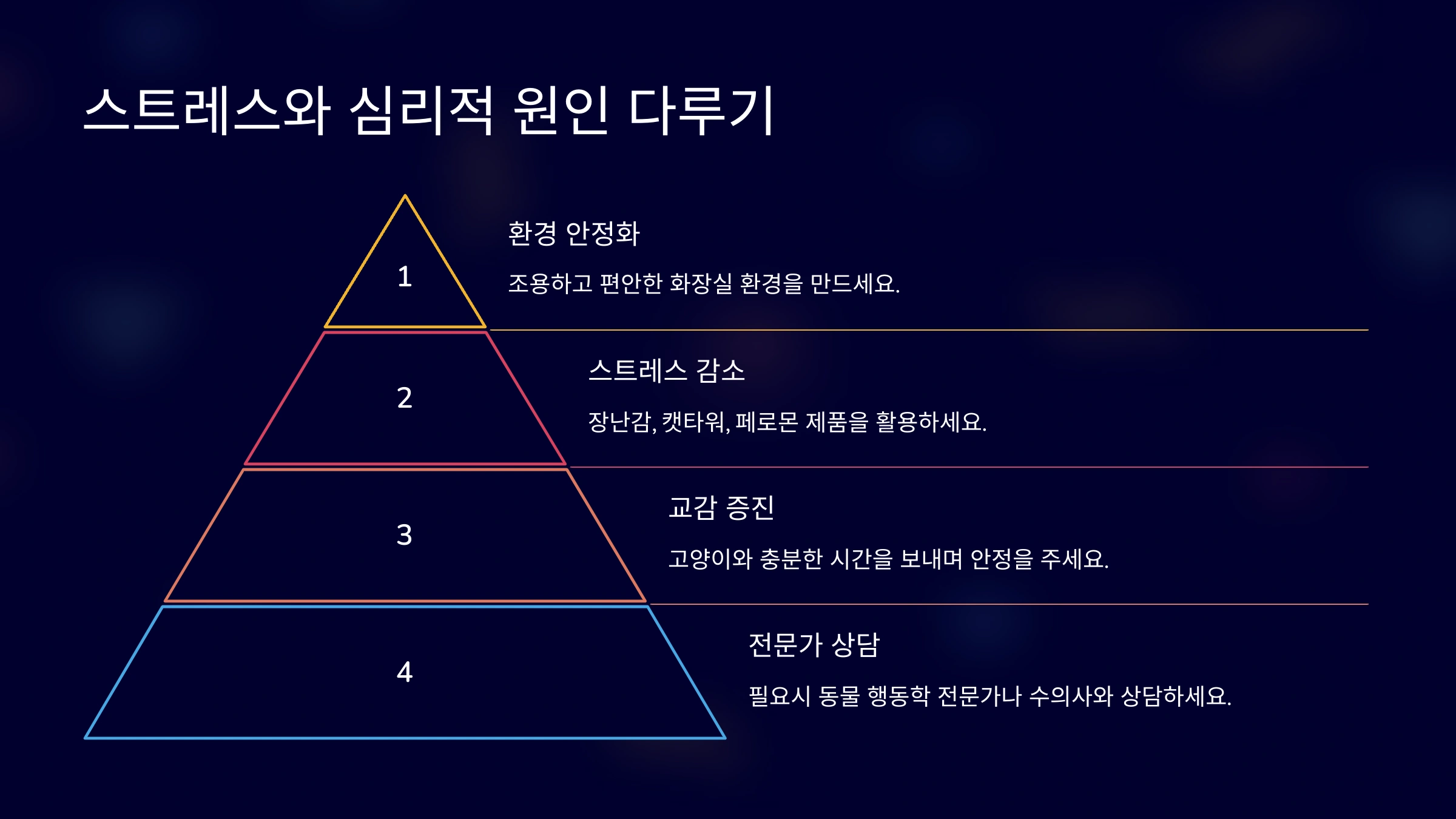 스트레스 관리에서 중요한 것은 고양이와의 교감을 늘리는 거예요. 고양이의 요구에 귀 기울이고, 충분히 함께 시간을 보내며 안정을 주는 것이 문제를 해결하는 데 도움이 될 거예요.