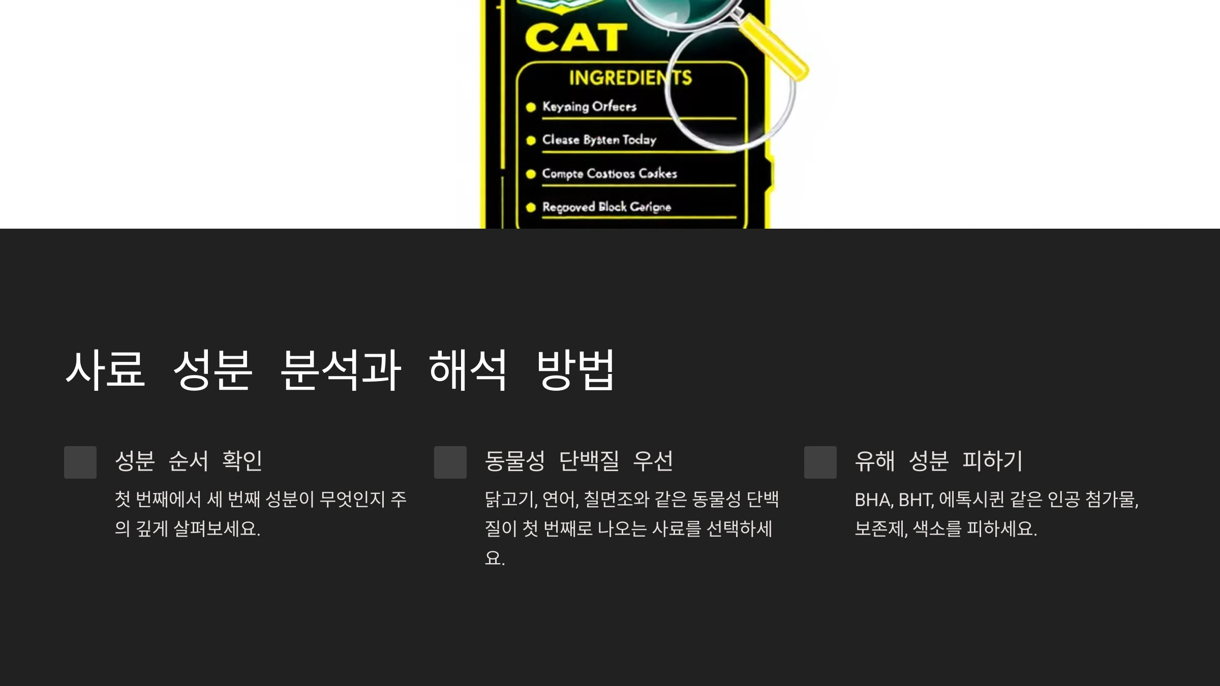사료 성분표를 읽는 것은 고양이의 건강에 적합한 사료를 선택하는 데 있어 매우 중요한 단계예요. 성분표는 보통 재료의 양이 많은 순서대로 나열되어 있어요. 따라서 첫 번째에서 세 번째 성분이 무엇인지 주의 깊게 살펴보는 것이 중요해요.