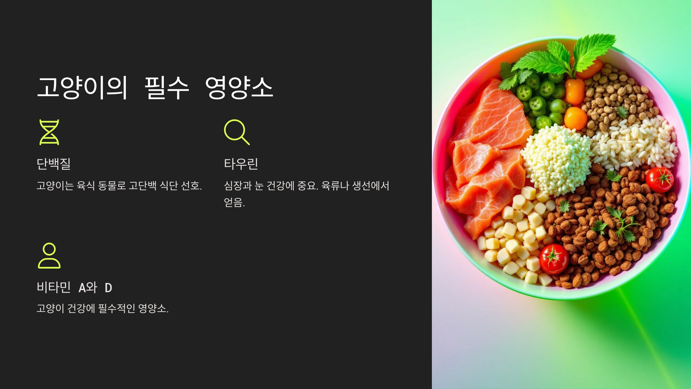 대표적인 필수 영양소에는 타우린, 아라키돈산, 비타민 A와 D가 있어요. 타우린은 고양이의 심장과 눈 건강에 중요한데, 육류나 생선에서 얻을 수 있죠. 이런 영양소가 부족하면 심각한 건강 문제가 생길 수 있어요.