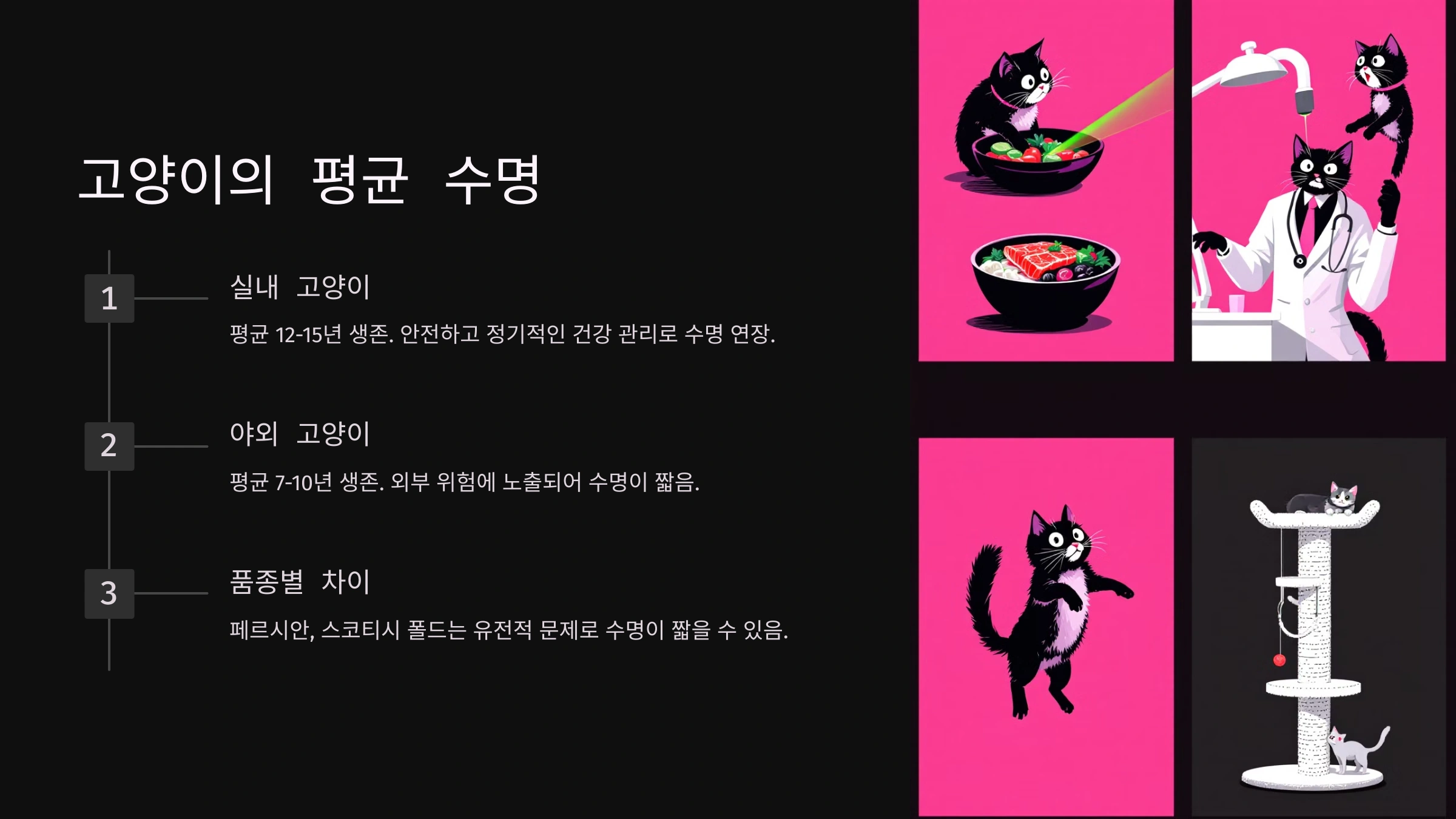 고양이의 수명은 다양한 요인에 의해 좌우돼요. 가장 중요한 요인은 생활 환경과 건강 관리예요. 실내에서 생활하면 외부 환경으로부터의 위험, 예를 들어 교통사고나 포식자 공격을 피할 수 있답니다.