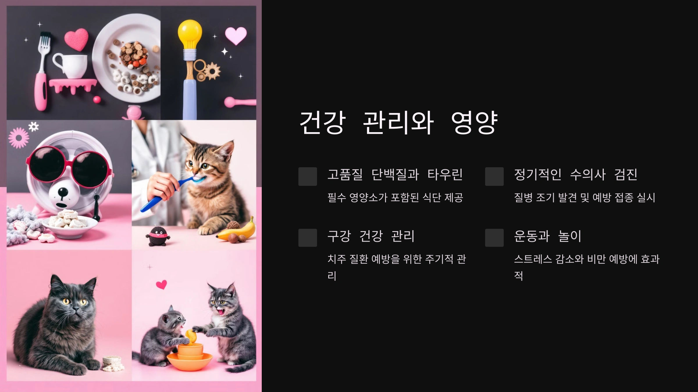 구강 건강도 신경 써야 해요. 치주 질환은 고양이에게 흔한 문제로, 심각한 경우 심장이나 신장 질환으로 이어질 수 있답니다. 주기적인 치아 관리와 적절한 사료 선택이 중요해요.