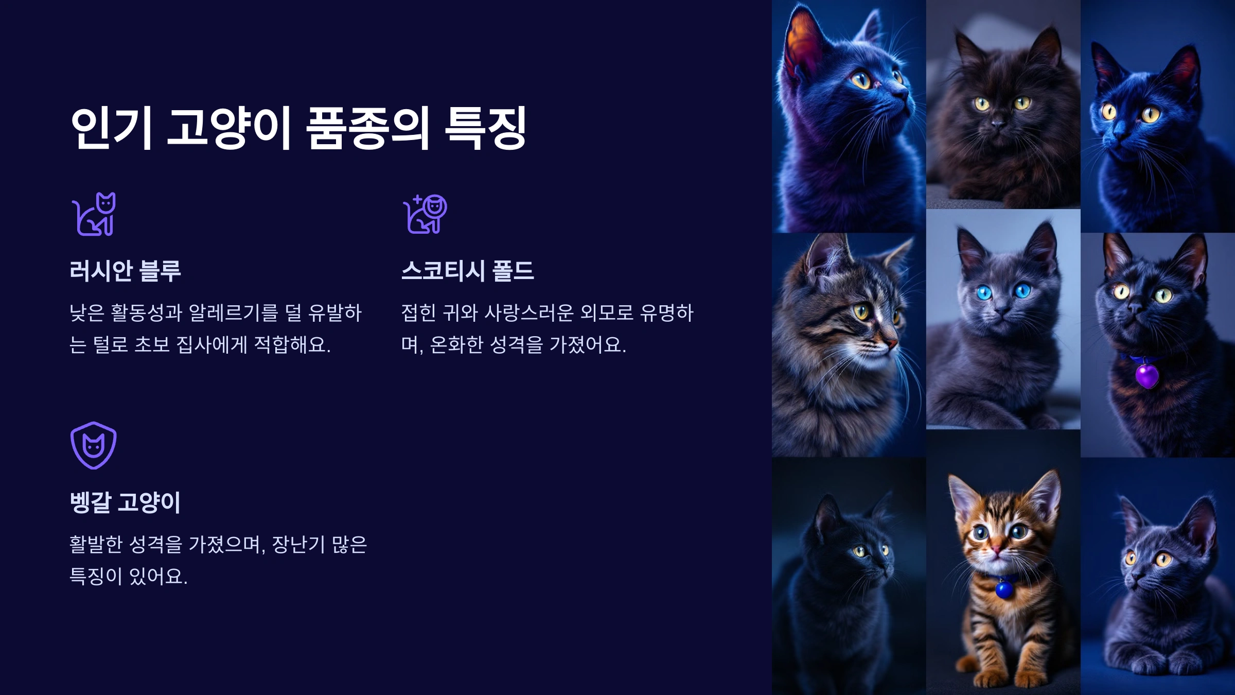 스코티시 폴드는 그 독특한 접힌 귀와 사랑스러운 외모로 많은 이들의 사랑을 받고 있어요. 이 품종은 대체로 온화하고 사람을 잘 따르는 경향이 있어, 가족 단위로 고양이를 키우고 싶은 집사들에게 적합해요. 이외에도 활발한 성격을 가진 벵갈 고양이나, 푹신한 털과 우아함으로 유명한 페르시안 고양이 등 다양한 품종이 있어요.