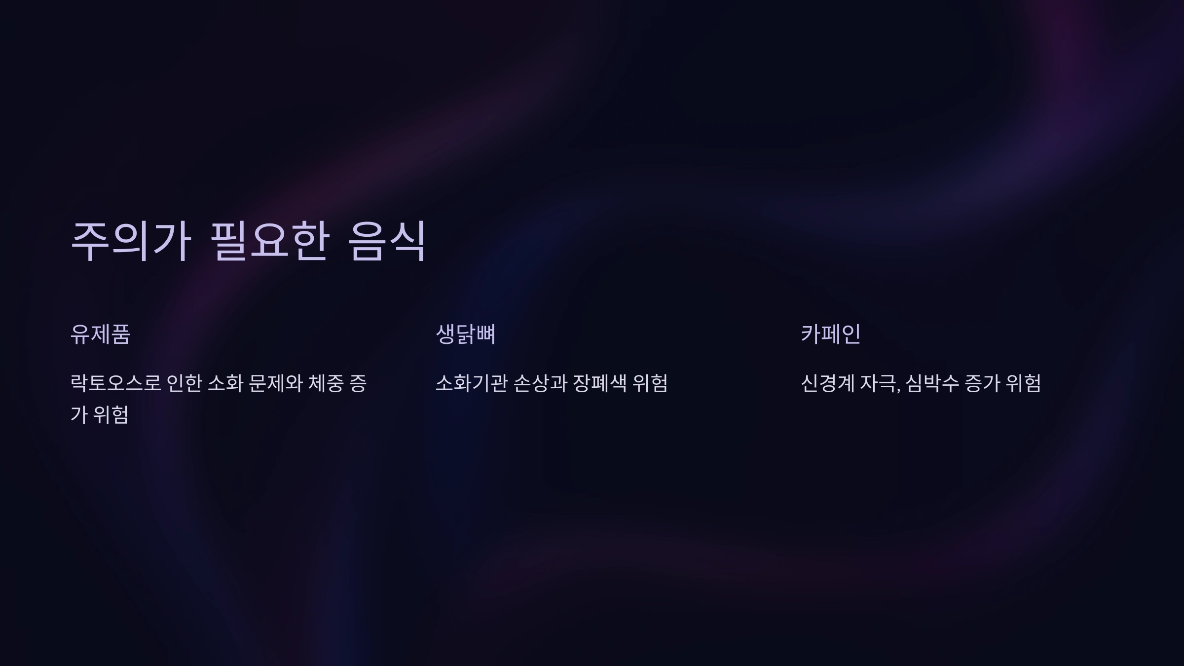 주의가 필요한 음식에는 유제품, 카페인이 함유된 음료, 생닭뼈, 알코올 등이 포함돼요. 이 음식들은 강아지의 소화기관에 부담을 줄 수 있거나 중독 증상을 일으킬 수 있답니다.