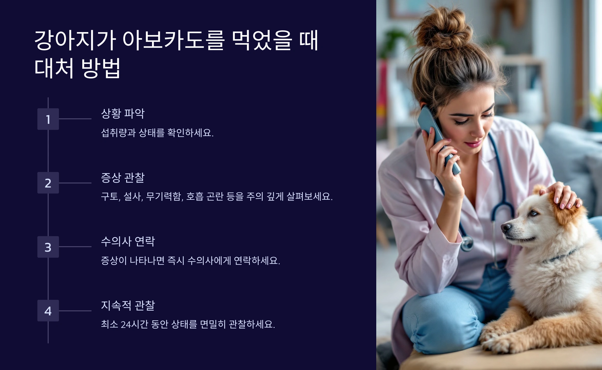 가장 중요한 점은 강아지의 증상을 예의주시하는 것이에요. 구토, 설사, 무기력함, 호흡 곤란 등의 징후가 나타난다면 즉시 수의사에게 연락해야 해요. 수의사에게 섭취한 아보카도의 양과 상태(익었는지, 씨 포함 여부 등)를 상세히 설명하면 더 정확한 도움을 받을 수 있답니다.