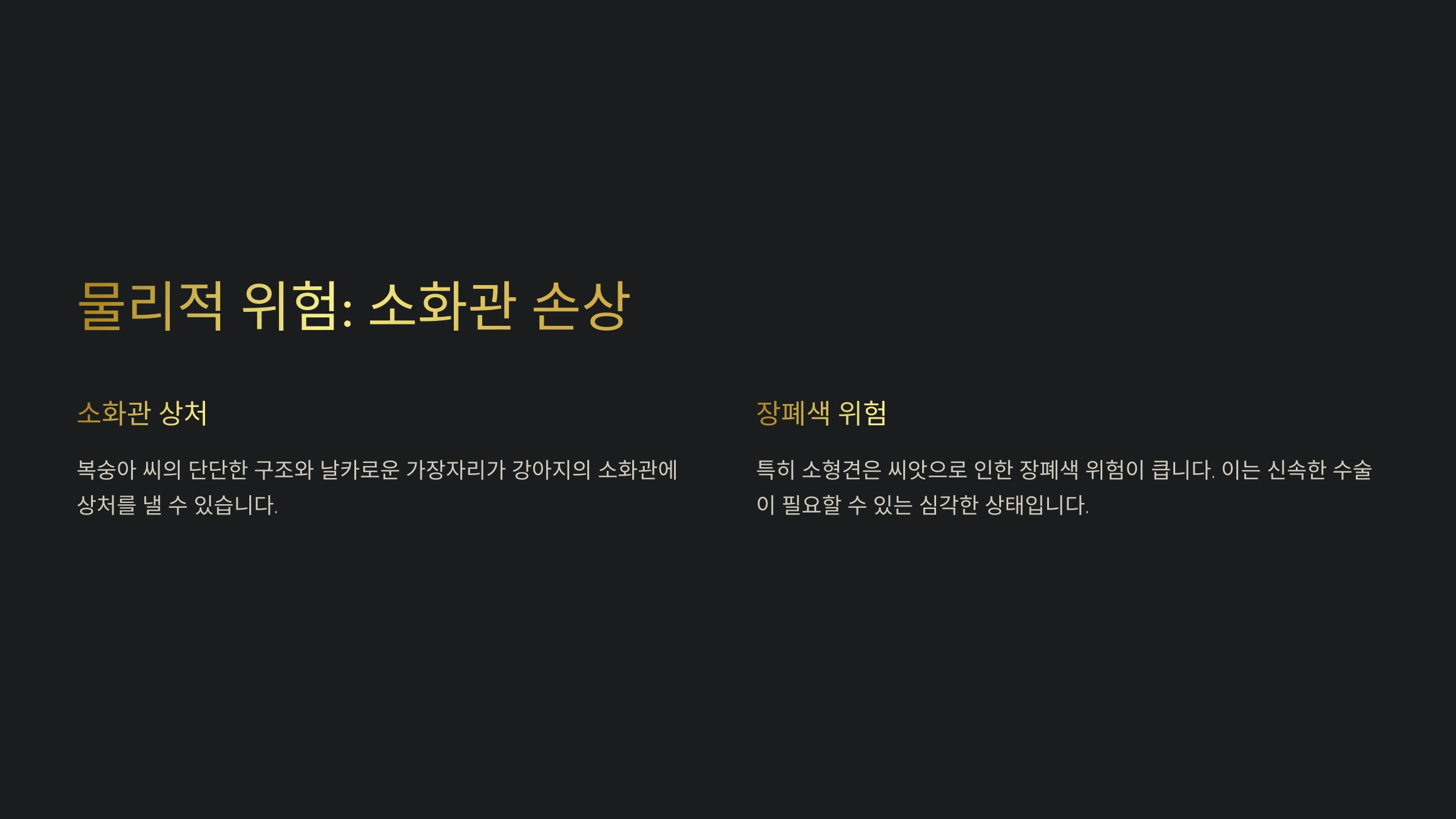 복숭아 씨는 독성 외에도 그 단단한 구조와 날카로운 가장자리 때문에 강아지의 소화관에 물리적인 문제를 일으킬 수 있어요. 복숭아 씨가 강아지의 식도, 위, 장 등을 통과하면서 상처를 내거나 막히는 경우가 생길 수 있답니다.