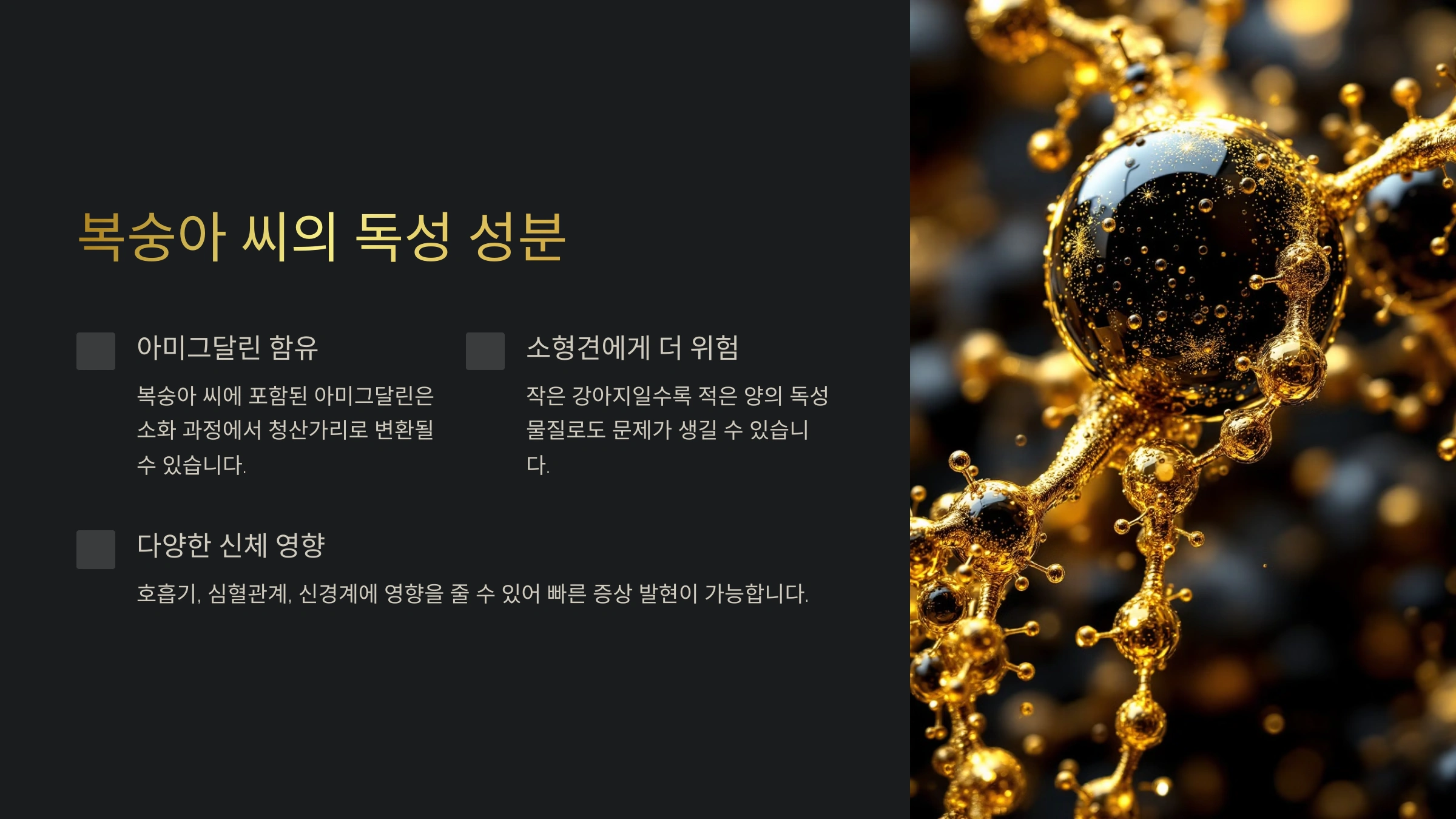 복숭아 씨에는 아미그달린(Amygdalin)이라는 화합물이 포함되어 있어요. 이 성분은 소화 과정에서 청산가리(시안화물)로 변환될 수 있답니다. 시안화물은 소량만으로도 강아지에게 매우 유독하며, 심각한 경우 생명을 위협할 수 있어요.