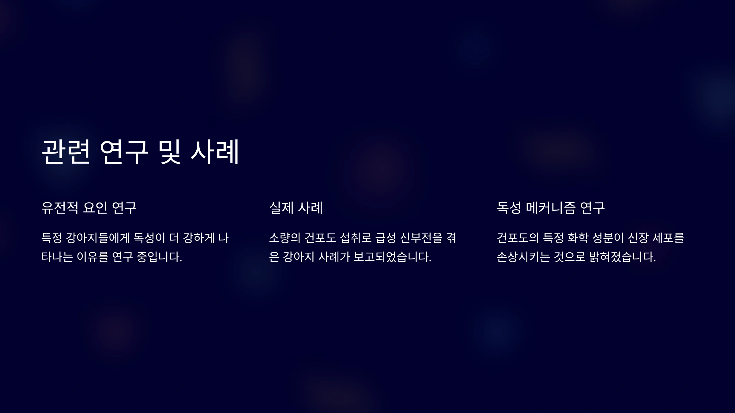 또 다른 연구에서는 건포도 독성이 나타나는 과정에 대해 자세히 설명했어요. 이 연구에 따르면, 건포도의 특정 화학 성분이 강아지의 신장 세포를 손상시키는 것이 주요 메커니즘으로 밝혀졌어요. 하지만 정확한 성분은 아직 완전히 규명되지 않았답니다.