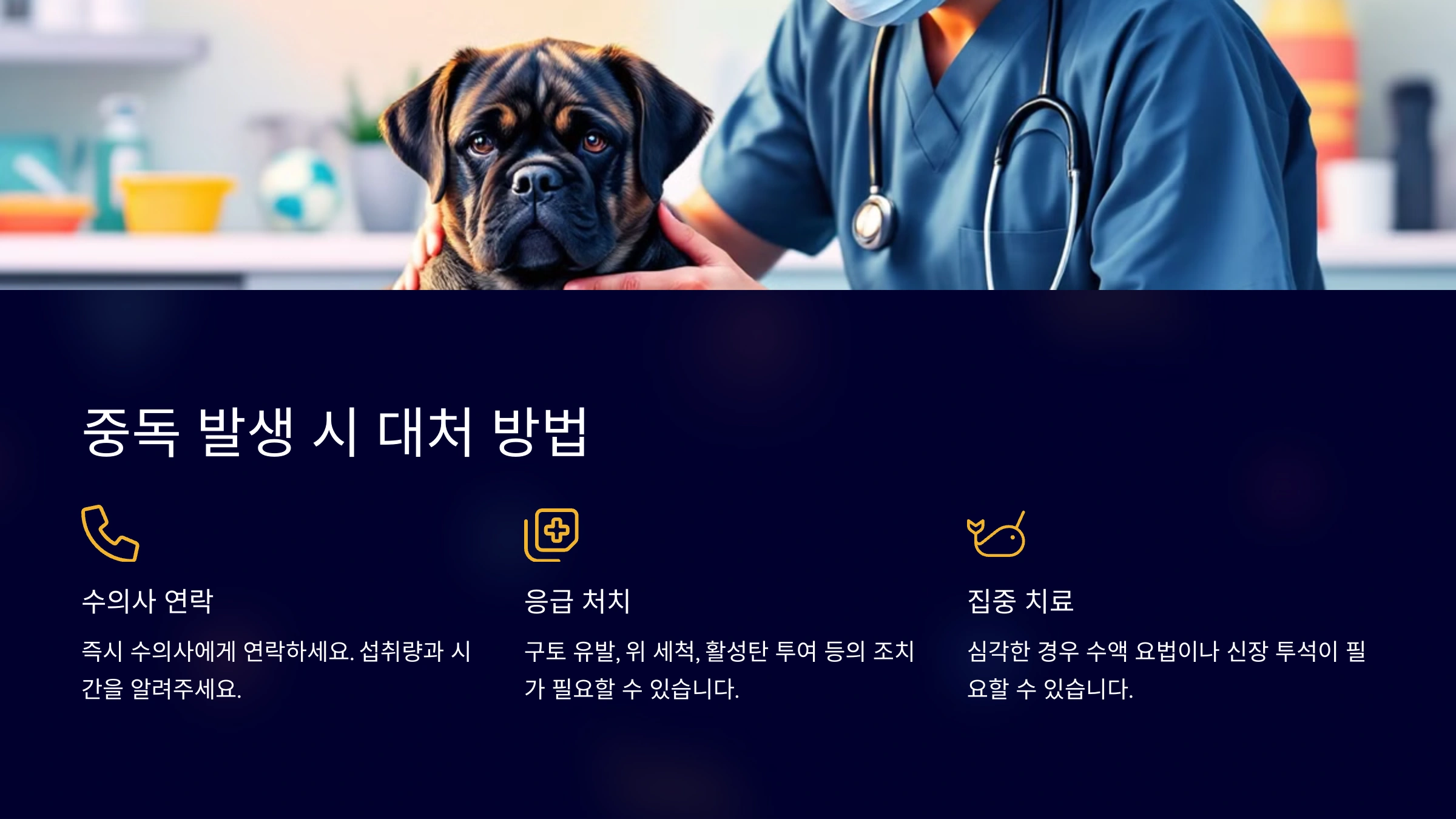 수의사는 강아지의 상태를 확인한 후 구토 유발, 위 세척, 활성탄 투여와 같은 조치를 취할 수 있어요. 구토 유발은 섭취 직후에만 효과적이므로, 시간이 오래 지났다면 다른 방식으로 치료를 진행할 거예요.