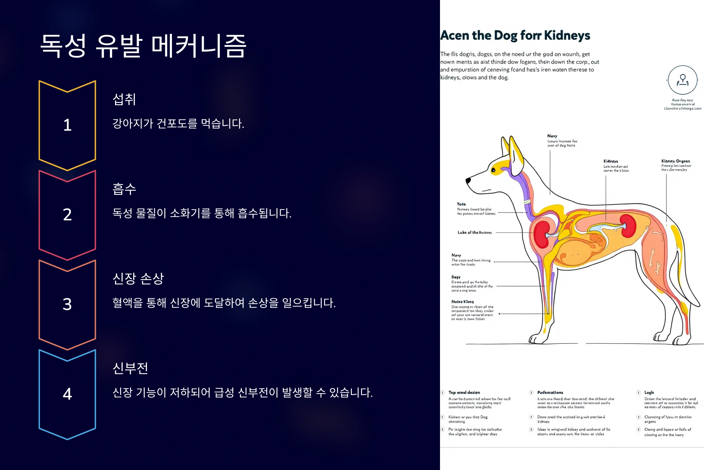 강아지가 건포도를 섭취한 후 독성 반응을 겪는 과정은 다음과 같아요. 건포도에 포함된 물질이 소화기를 통해 흡수되고, 혈액으로 들어가 신장에 손상을 일으키는 방식으로 작용해요. 이로 인해 신장이 정상적으로 작동하지 못하게 되죠.